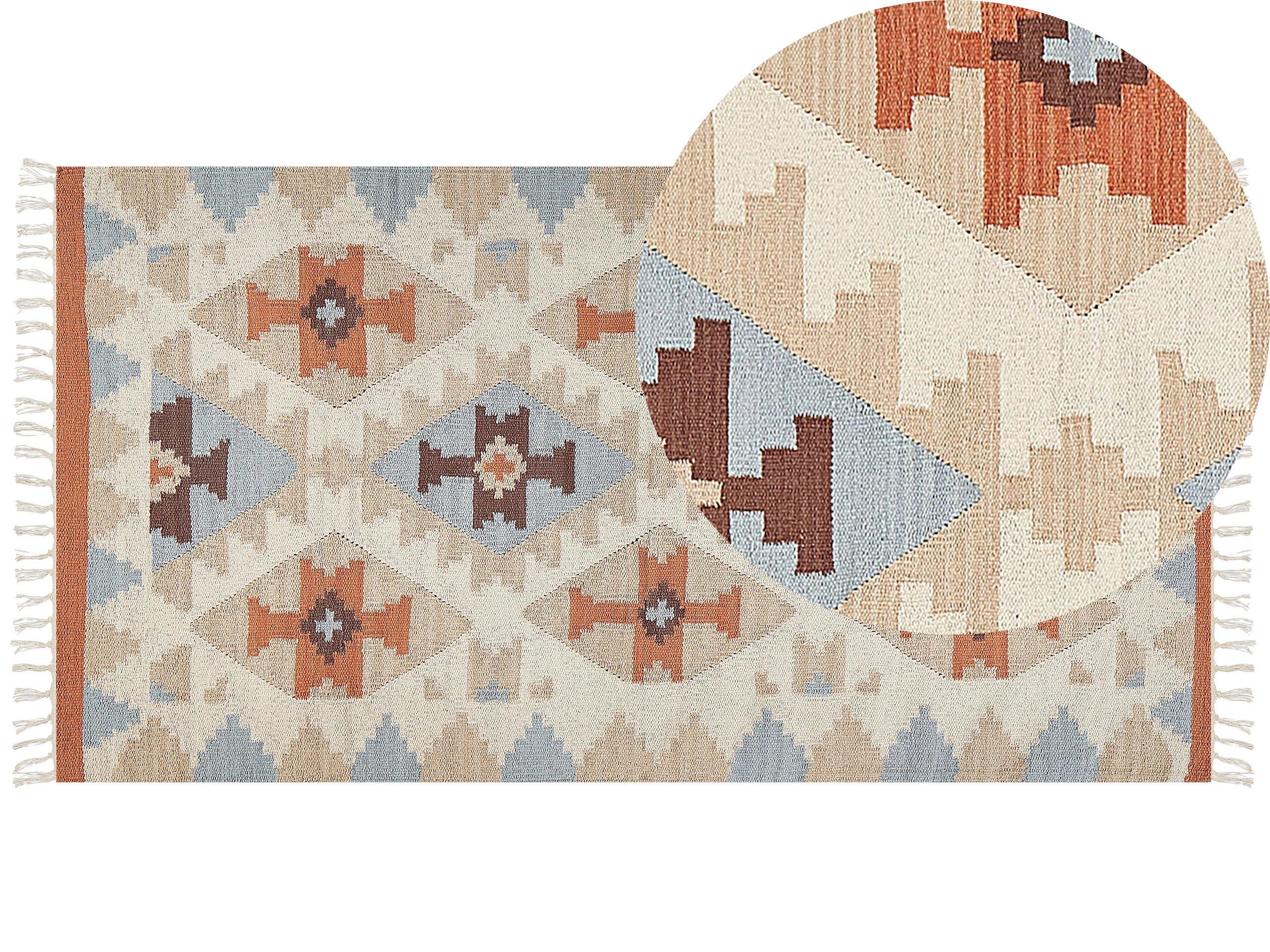 Tapis avec motif traditionnel. Mettez en valeur la décoration de votre salon ou de votre chambre avec ce magnifique tapis Kilim. Il est tissé à la main en coton, ce qui lui confère une grande résistance et une belle qualité. Le tapis est orné d'un motif géométrique éclatant, qui apporte une touche d'élégance raffinée à chaque pièce. Son design universel vous permet de changer de décoration facilement. Profitez du confort sans sacrifier la qualité, car ce tapis est lavable en machine, ce qui garantit un entretien facile.