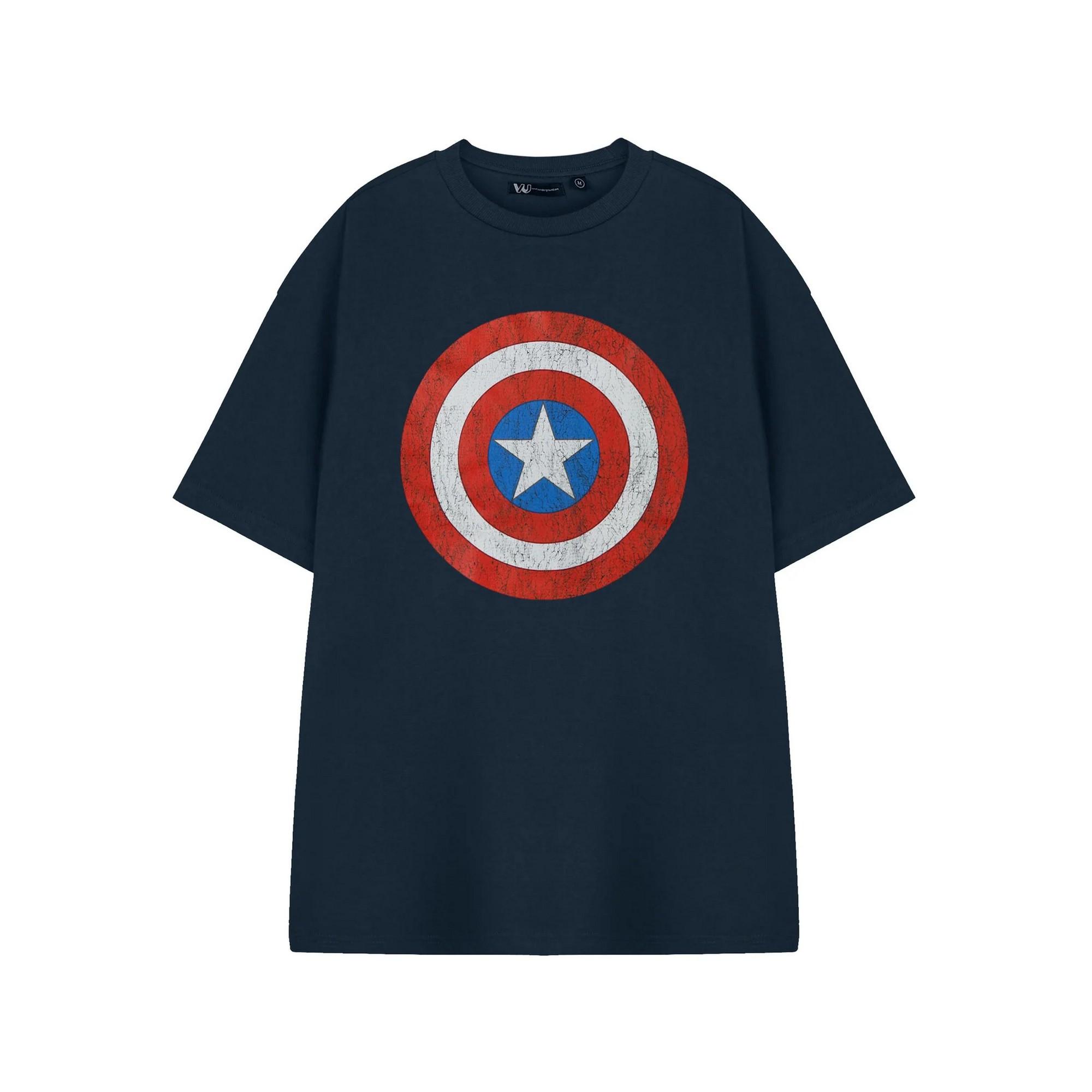 Ce t-shirt à manches courtes présente un col rond classique et un imprimé proéminent du bouclier de Captain America sur le devant. Le design offre une coupe confortable et régulière, ce qui en fait un ajout polyvalent à toute garde-robe décontractée.