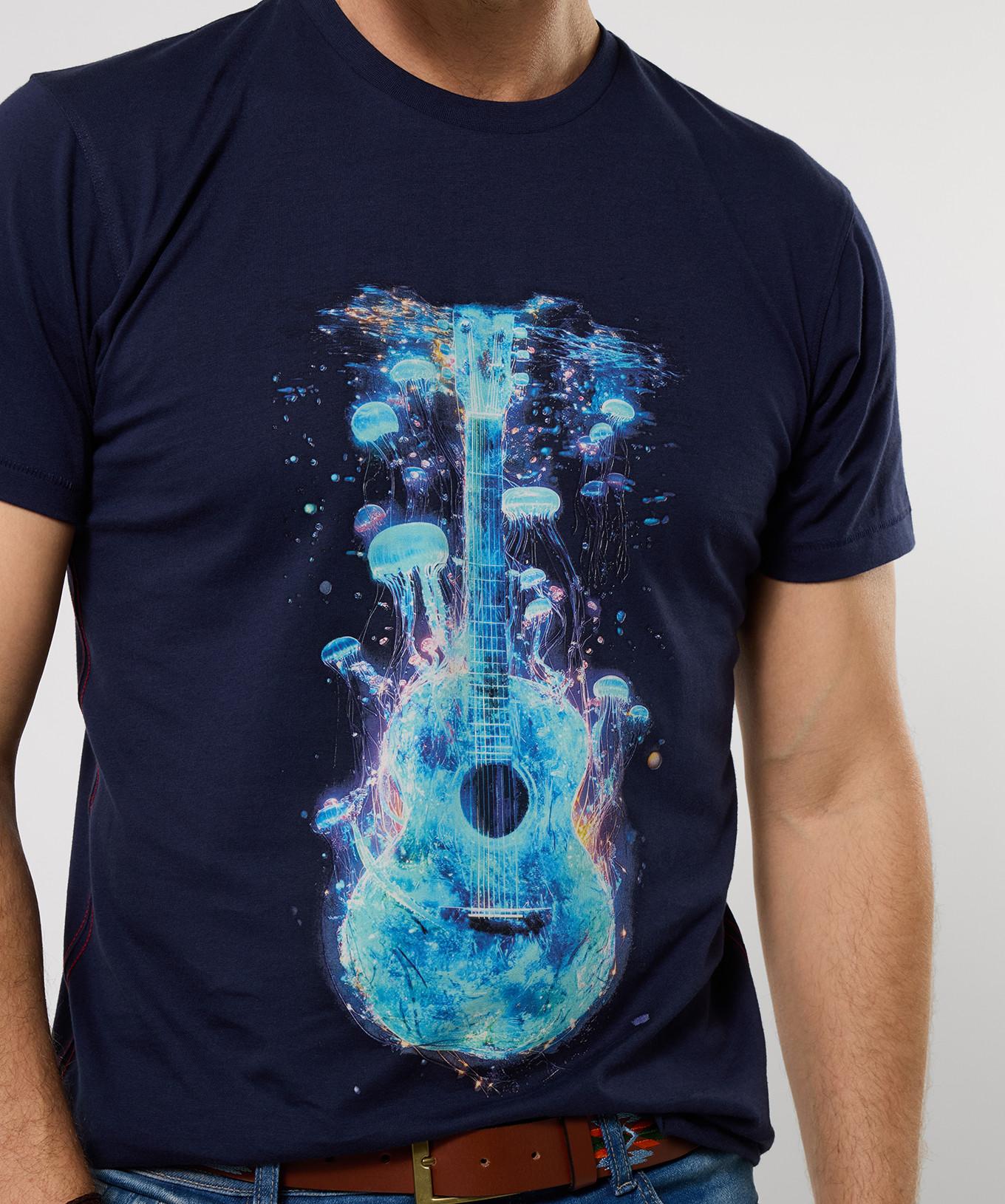 Tee-shirt guitare et méduses, mix musique et vibes tropicales, idéal pour plage et style relax.