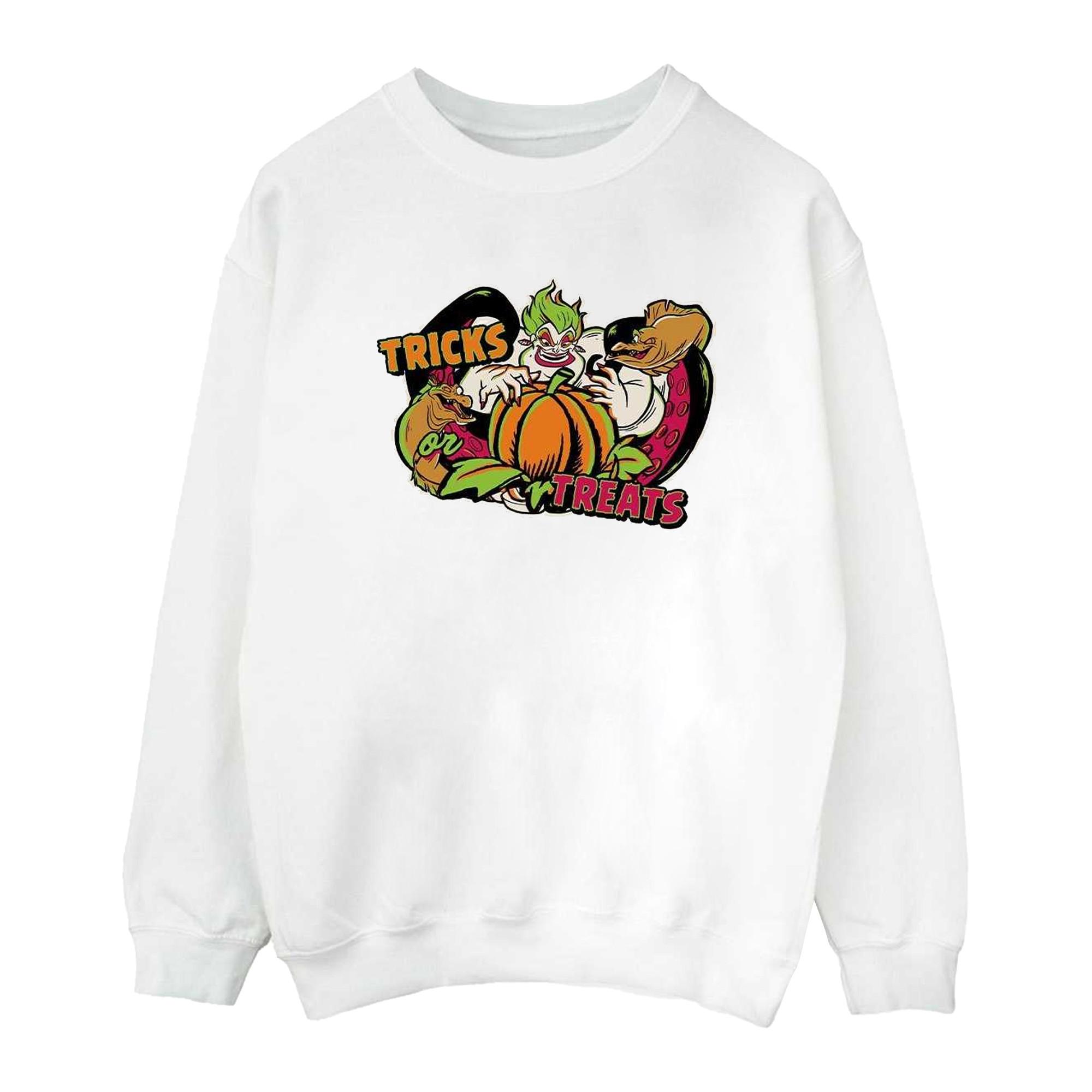 Ce sweat-shirt présente un motif ludique "Tricks or Treats", parfait pour les célébrations d'Halloween ou pour ajouter une touche amusante au quotidien. Le design inclut les personnages Flotsam, Jetsam et Ursula, une citrouille et d'autres éléments festifs, le tout sur une silhouette classique à col rond.