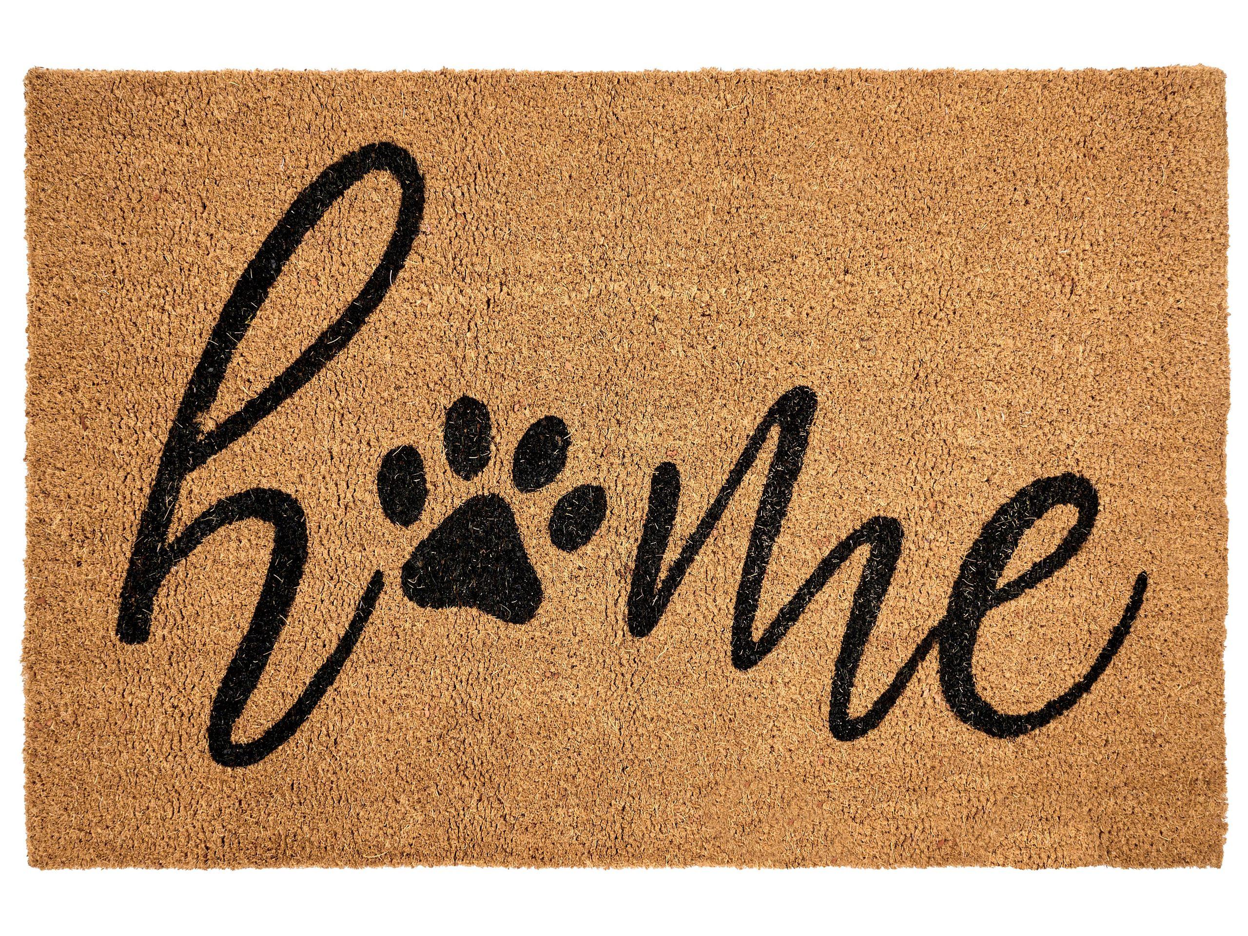 Paillasson de bienvenue avec support antidérapant. Ce paillasson fonctionnel est fabriqué à partir de fibre de coco durable, qui élimine efficacement la saleté et l'humidité des chaussures, et il est doté d'un revêtement antidérapant qui le maintient bien en place. Mais il n'est pas seulement fonctionnel, il est également décoratif : le mot « home » (maison) avec une empreinte de patte à la place de la lettre « o » en fait un ajout charmant à tout intérieur, en particulier pour les amoureux des animaux.