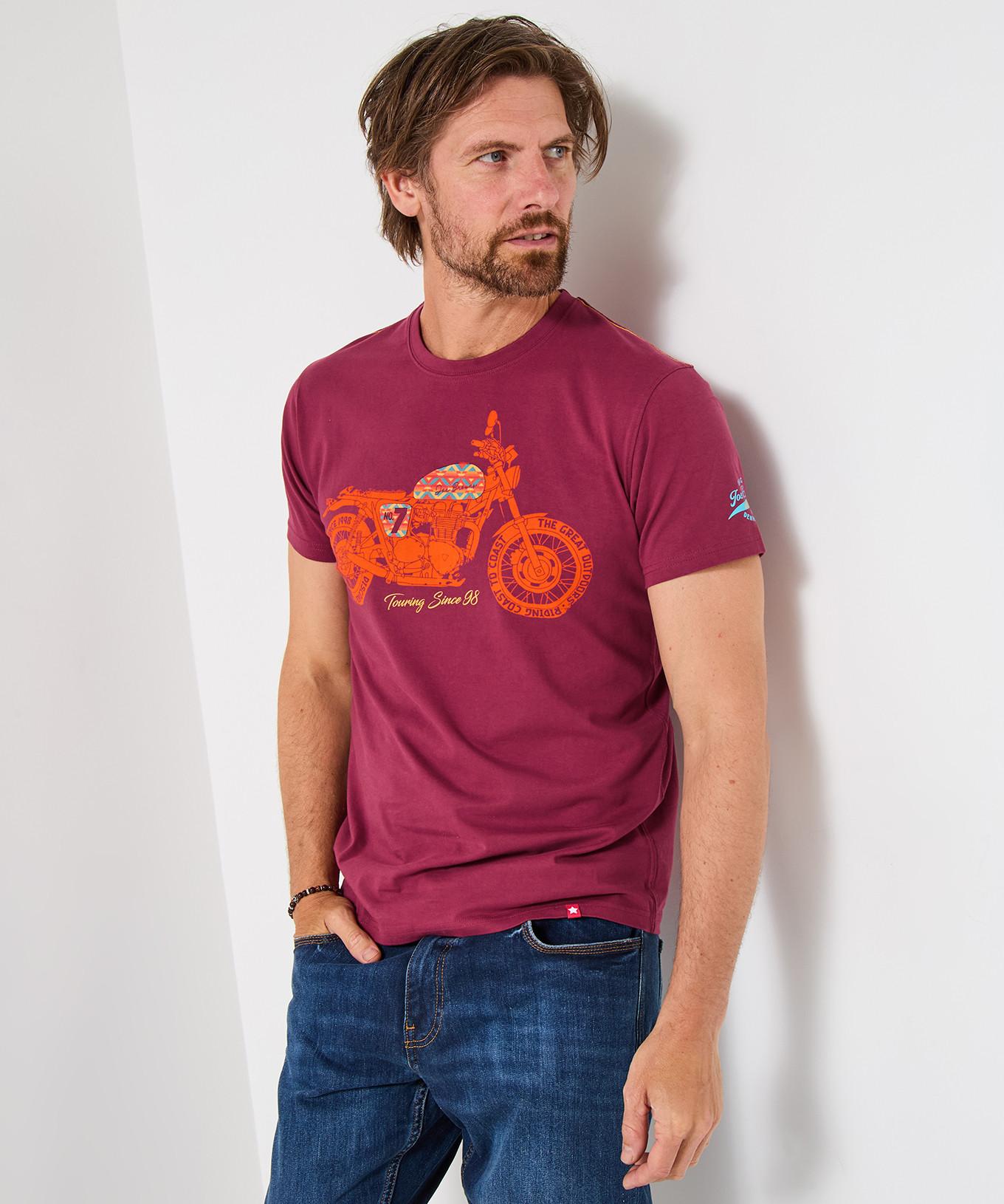 Ce t-shirt motard élégant présente un col rond classique et un imprimé graphique distinctif sur le devant. Le design met en valeur une moto d'inspiration vintage avec des éléments textuels, ajoutant une touche d'esprit aventureux au vêtement. C'est une pièce polyvalente pour les tenues décontractées.