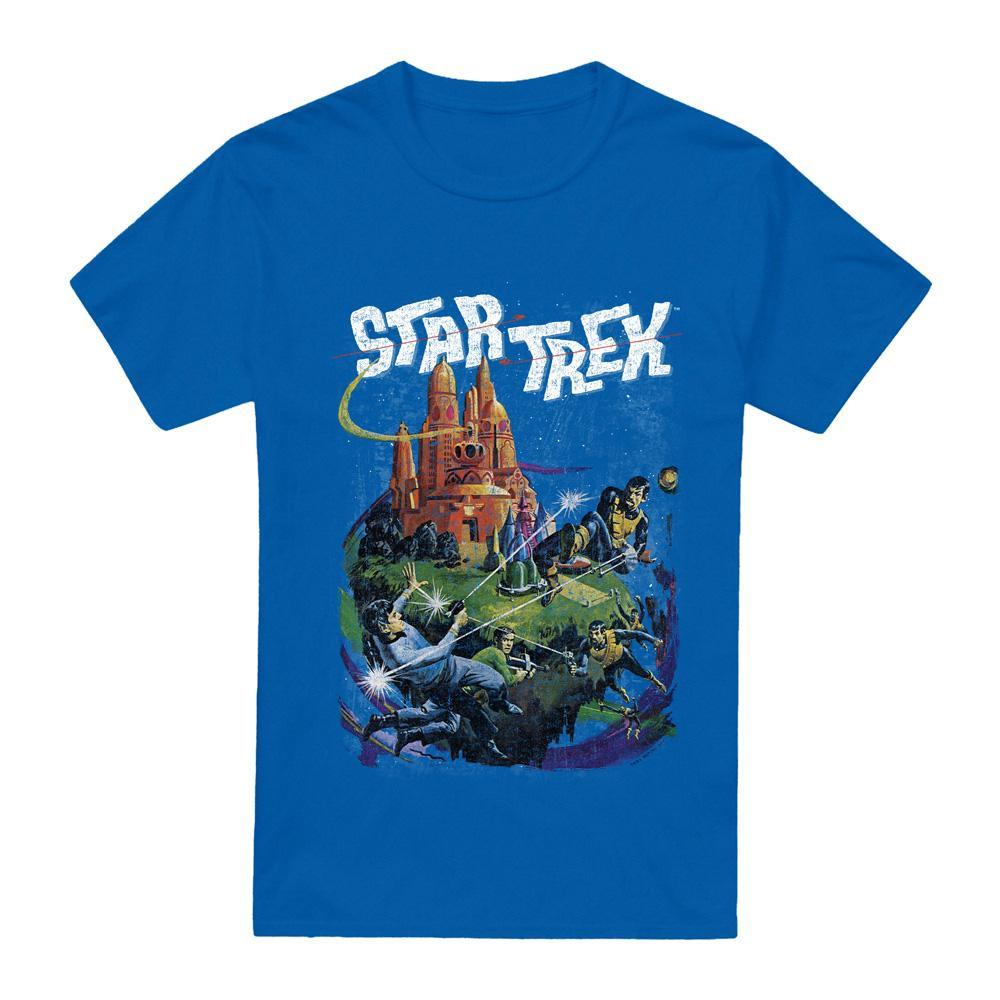 Ce T-shirt présente un imprimé graphique vibrant inspiré de Star Trek, mettant en scène une scène de bataille dynamique avec des personnages emblématiques et un paysage fantastique. Le col rond classique et les manches courtes offrent une coupe confortable et polyvalente, ce qui en fait un excellent ajout à toute garde-robe décontractée.