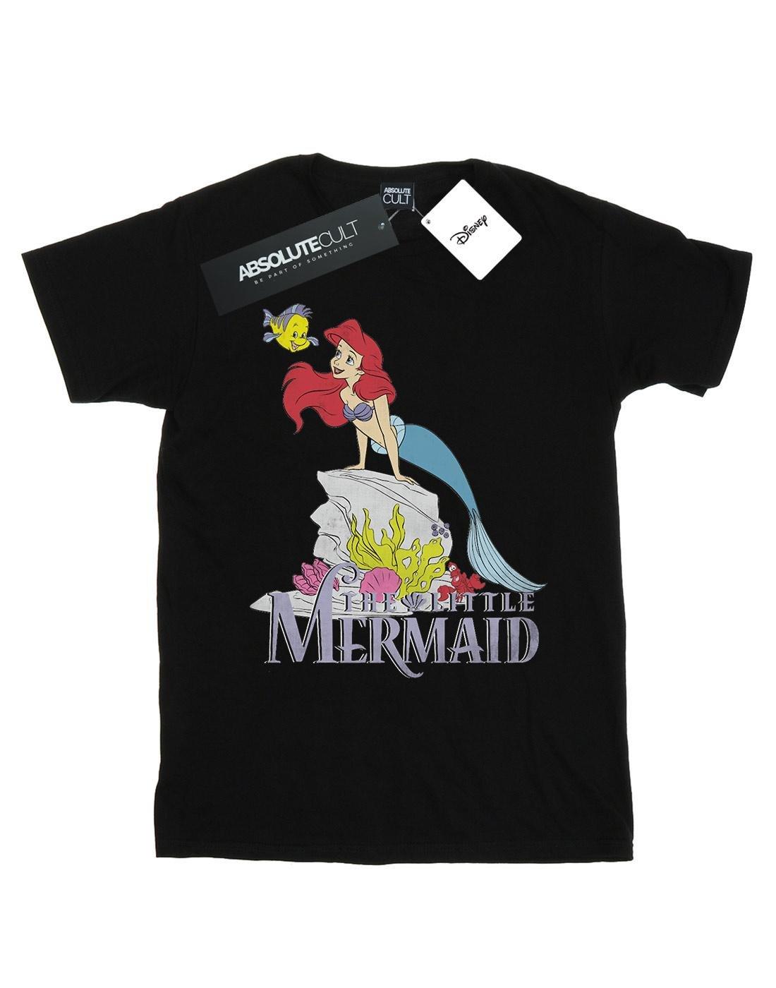 Ce T-shirt présente un col ras-du-cou classique et des manches courtes, offrant une coupe confortable et polyvalente pour un usage quotidien. Le devant du T-shirt arbore un imprimé graphique vibrant d'Ariel de La Petite Sirène de Disney, accompagnée de son fidèle ami Polochon, perchée sur un rocher au milieu de la flore sous-marine. Le logo emblématique "The Little Mermaid" est affiché sous l'illustration.
