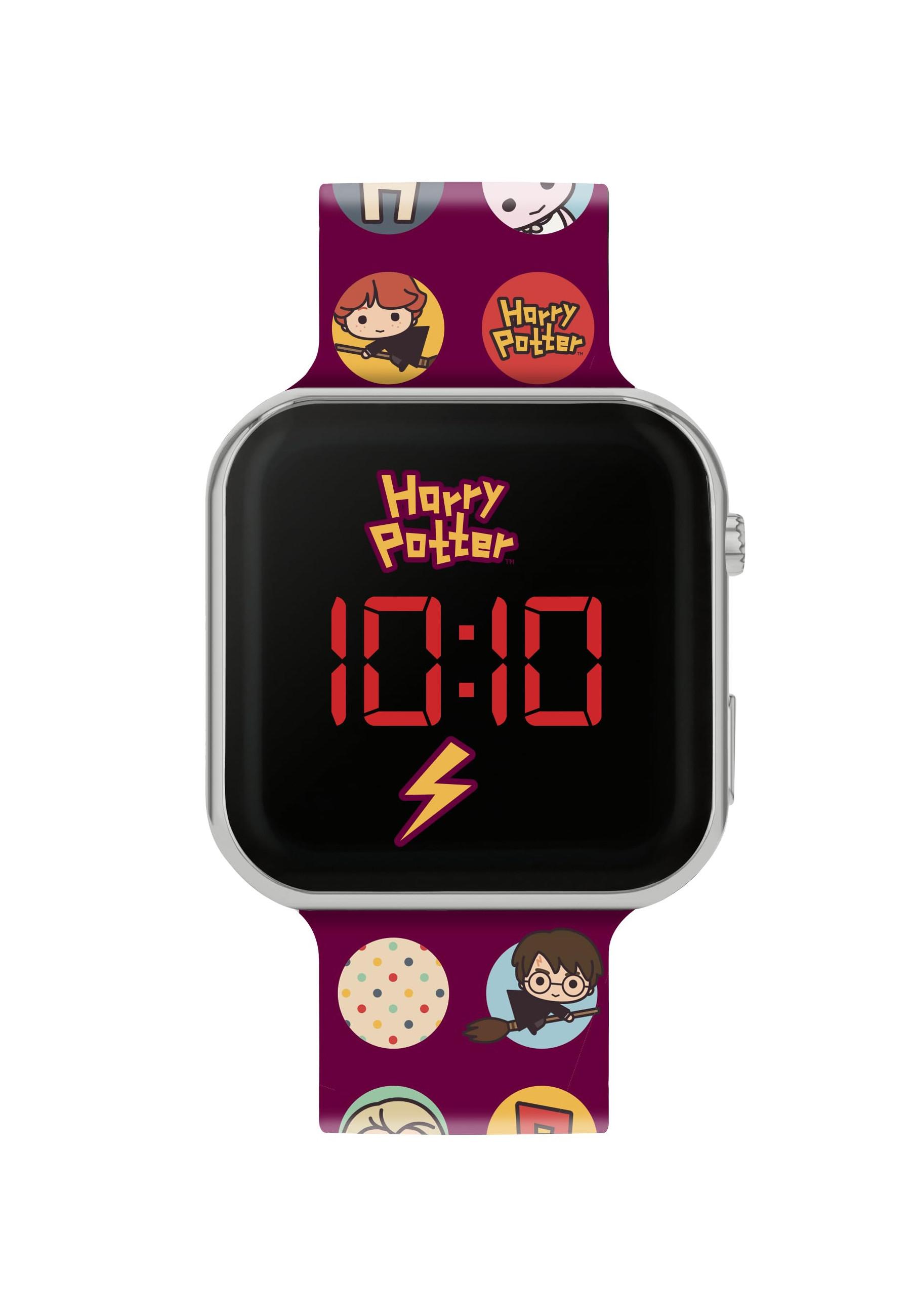 Montre LED Harry Potter. Elle est dotée d'un bracelet en plastique rouge à l'effigie de Harry Potter, d'une fermeture à boucle traditionnelle et d'un affichage numérique rouge. Emballée sur une carte de soutien de la marque.