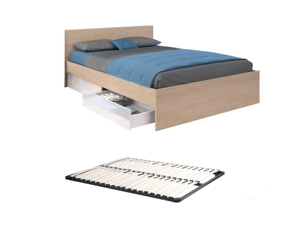Vente-unique, Lit avec 2 tiroirs 160 x 200 cm - Coloris : Naturel et blanc brillant + sommier - VELONA