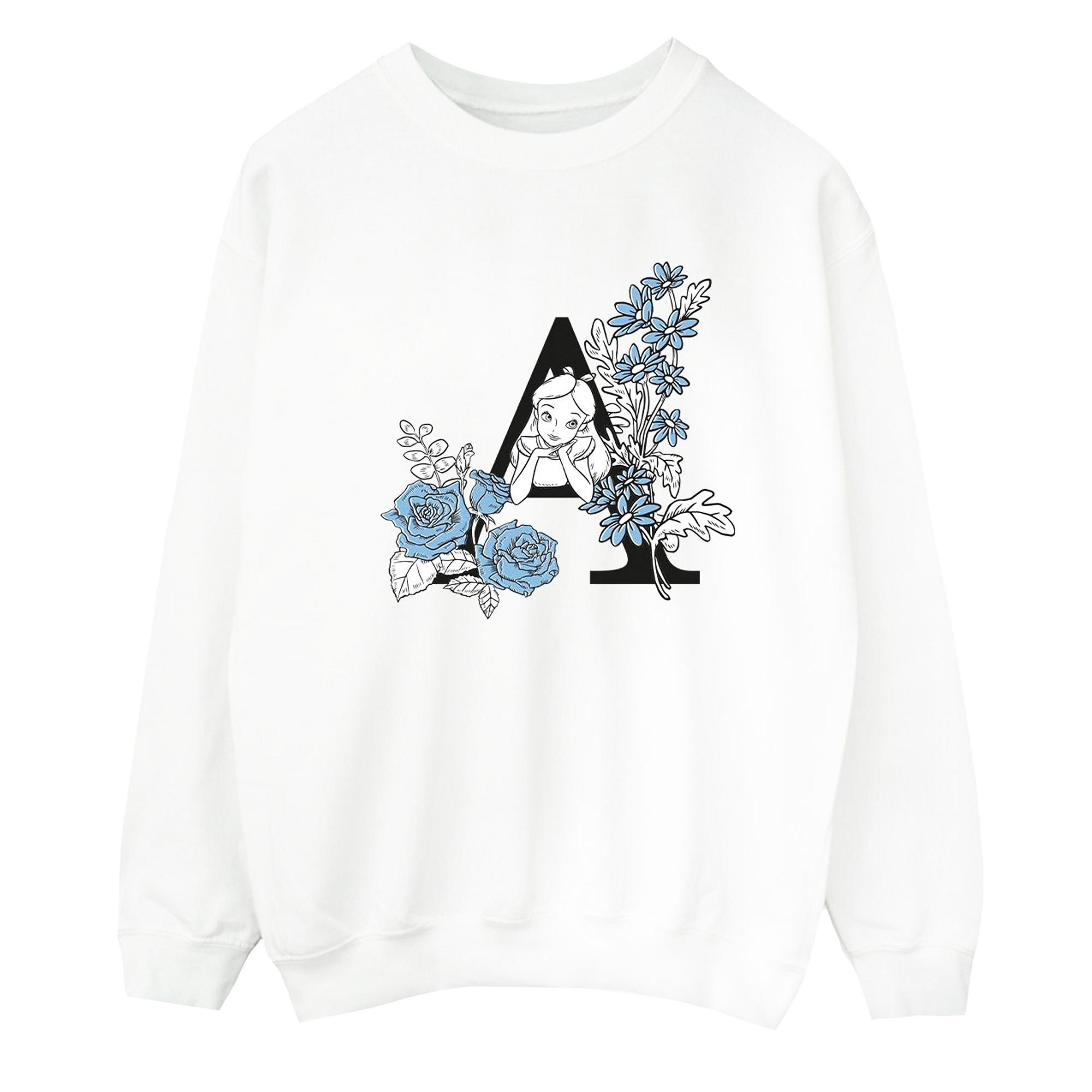 Ce sweatshirt Alice au Pays des Merveilles présente un charmant imprimé graphique, ce qui en fait un ajout ravissant à toute garde-robe décontractée. Le design montre Alice jetant un coup d'œil derrière une lettre 'A' stylisée, entourée de délicates roses bleues et de feuillage.
