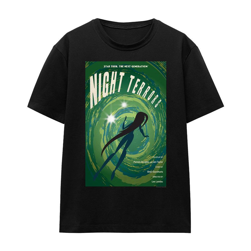 Ce T-shirt présente un imprimé graphique inspiré de « Night Terrors », saison 4 épisode 17 de Star Trek : The Next Generation. Le design capture l'essence de l'épisode avec une représentation stylisée d'un personnage au milieu de motifs verts et bleus tourbillonnants, évoquant un sentiment de mystère et d'inconnu. Le T-shirt offre une coupe confortable, ce qui le rend adapté à un usage quotidien ou pour montrer son appréciation pour la série de science-fiction emblématique.