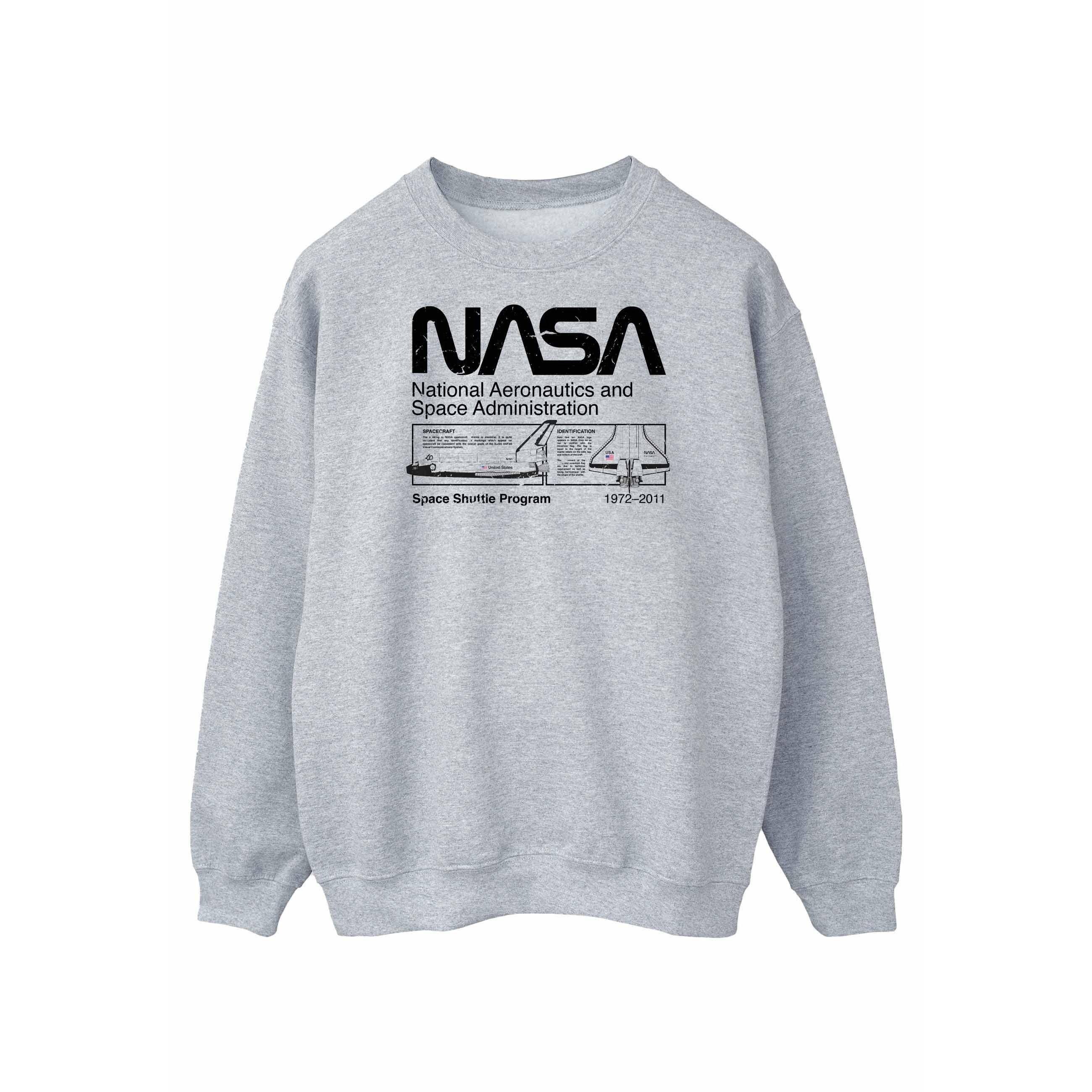 Ce sweatshirt présente un col rond classique et des manches longues, offrant une coupe confortable et décontractée. Le devant est orné d'un imprimé graphique affichant le logo de la NASA, le nom complet « National Aeronautics and Space Administration » et des détails sur le « Space Shuttle Program » de 1972-2011, y compris une illustration schématique.