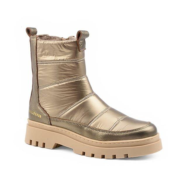 Bottines chaudes Belsize Park de la marque Bullboxer, conçues pour un usage général et quotidien. Ces bottines chic et polyvalentes disposent d'un dessus et d'une tige en cuir et textile, offrant un mélange de style et de confort. Leur doublure textile chaude garantit un confort optimal tout au long de la journée. Les semelles intérieures synthétiques amovibles facilitent la maintenance des bottines. Les semelles en gomme assurent une durabilité et une protection solide. Les détails de la bottine en cuir et textile, comme les visibles coutures sur les panneaux supérieurs et les poignées à chaque extrémité, ajoutent une touche de sophistication. La couleur or éclatante de ces bottines les rend parfaites pour un look élégant et sophistiqué.