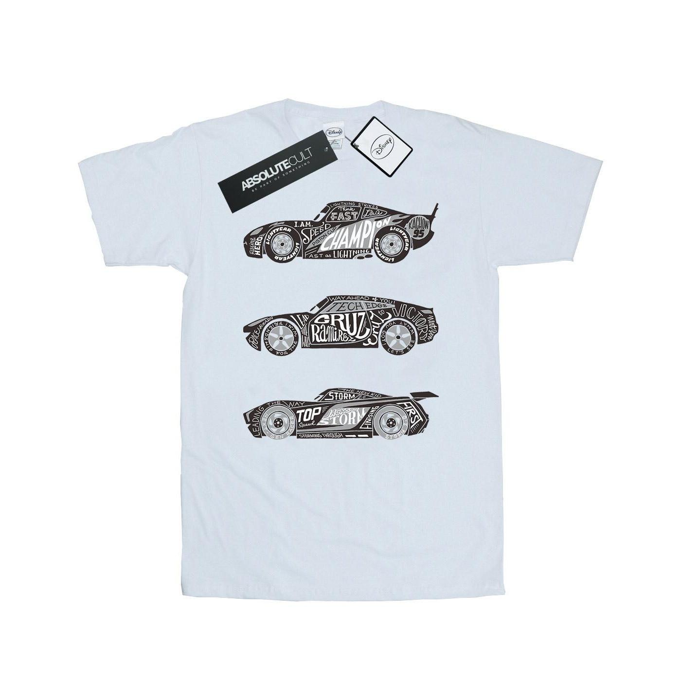 Ce T-shirt présente un imprimé graphique inspiré de la franchise Disney Pixar Cars. Le design met en scène trois voitures de course emblématiques, chacune minutieusement détaillée avec une typographie formant leurs formes et leurs noms. C'est un ajout confortable et élégant à toute garde-robe décontractée.