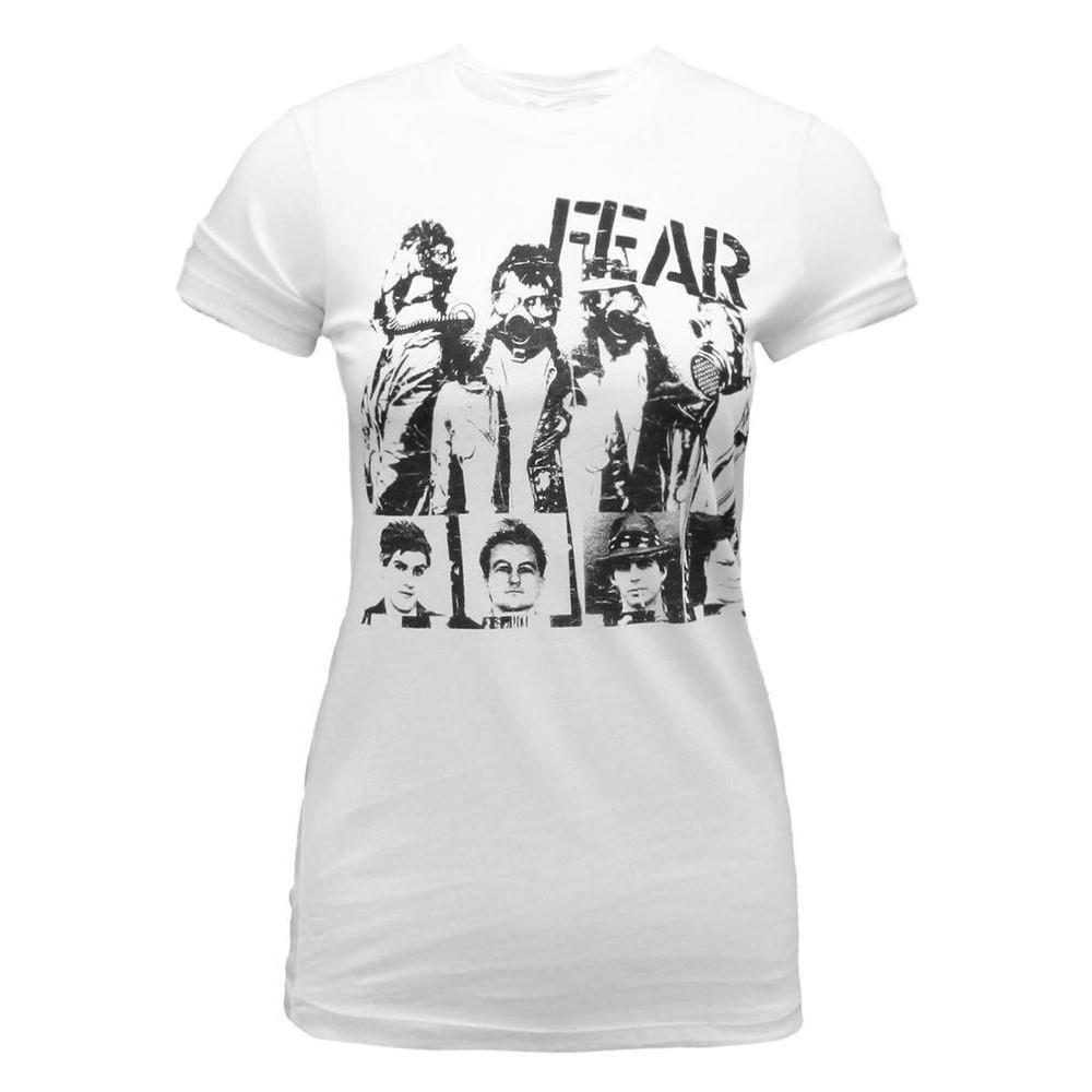 Ce T-shirt présente un imprimé graphique saisissant du groupe Fear, montrant des membres avec des masques à gaz et des portraits individuels. Le design capture une esthétique brute et iconique, en faisant une pièce distinctive pour les fans et ceux qui apprécient les vêtements graphiques audacieux.