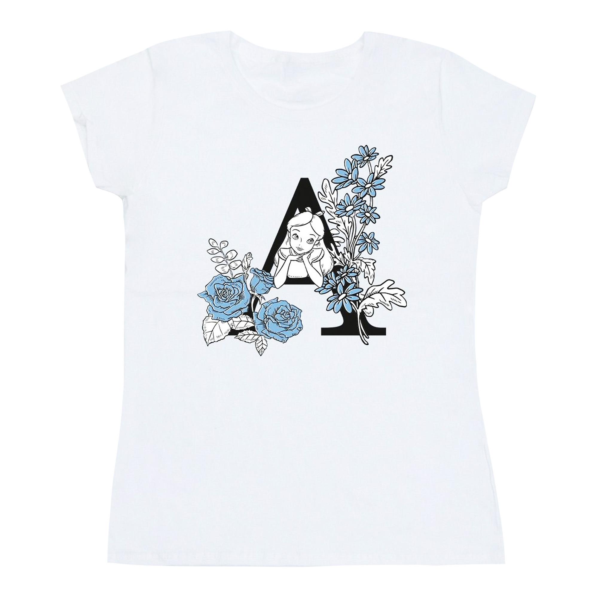 Ce T-shirt Alice au Pays des Merveilles présente un charmant imprimé graphique d'Alice jetant un coup d'œil derrière une lettre 'A' stylisée, ornée de délicates fleurs bleues et de feuillage. Le col rond classique et les manches courtes en font un ajout polyvalent à toute garde-robe décontractée.