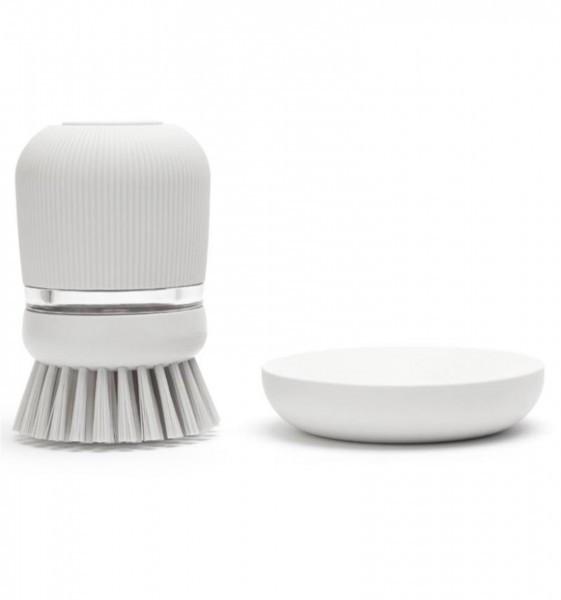 En plastique, manche ergonomique, pour un récurage vigoureux, toujours assez de liquide vaisselle, avec bac à liquide vaisselle, bonne prise en main, même mouillé, facile à remplir, mécanisme à vis, grande ouverture pour le remplissage, bac de rangement l'eau après utilisation, avec ceux remplaçables poils en nylon