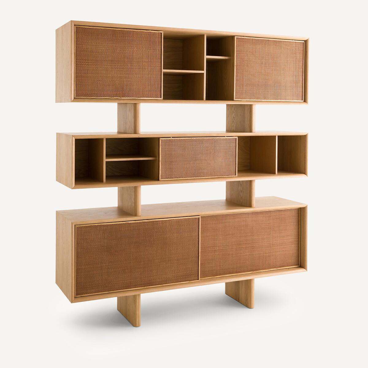 Inspiré par le mouvement moderniste, ce vaisselier est composé de trois caissons, rehaussés par un piètement et des entretoises du même bois. Derrière ses cinq portes coulissantes, Propono est doté dune belle capacité de rangement avec de nombreuses niches. Une exclusivité signée AMPM.Description