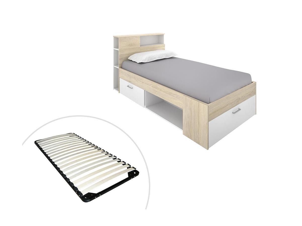 Vente-unique Lit avec tête de lit rangements et tiroir - 90 x 190 cm - Blanc et Naturel + Sommier - LEANDRE