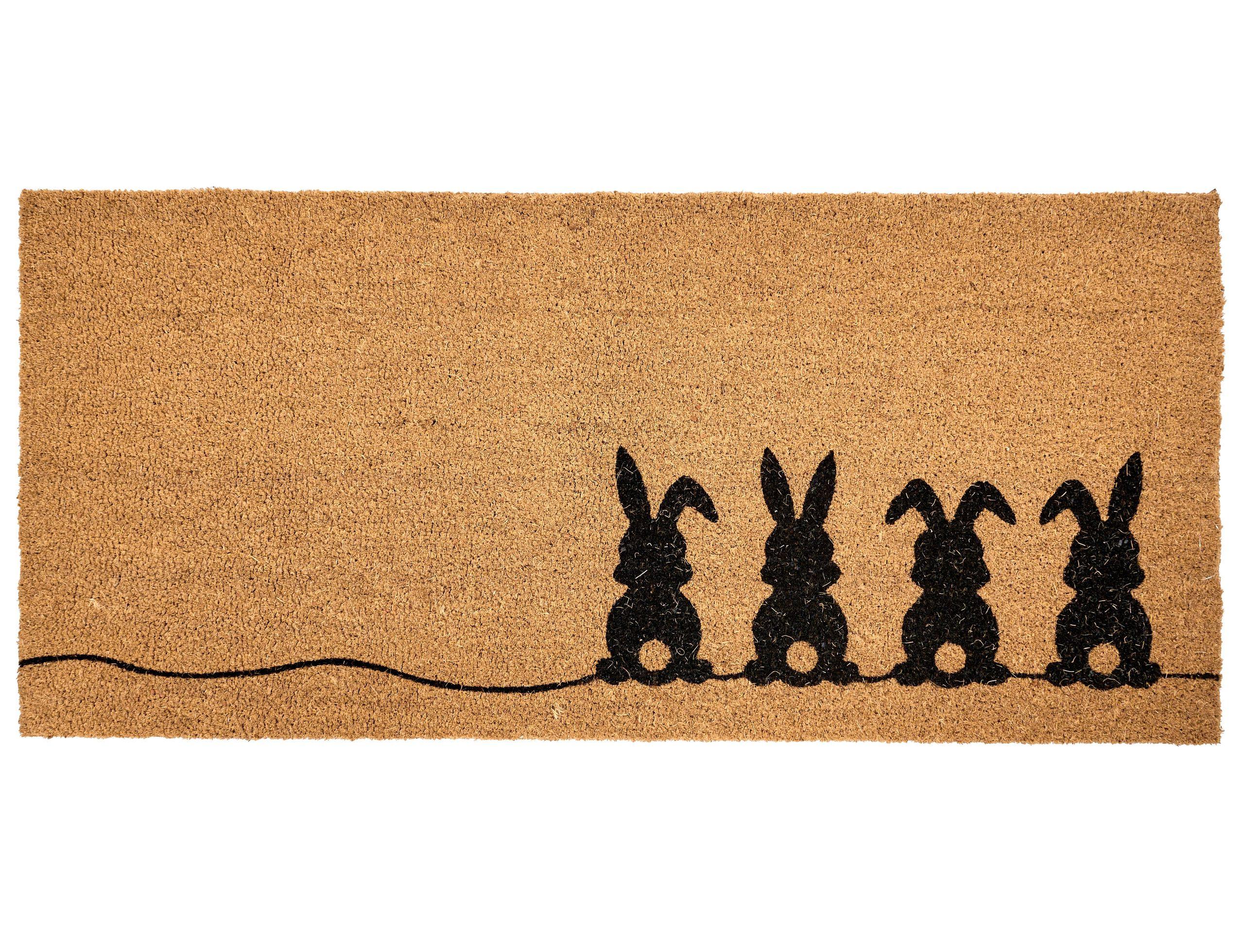 Paillasson antidérapant avec motif lapin. Ce paillasson est un ajout charmant et pratique à votre porte d'entrée. Fabriqué à partir de fibre de coco de haute qualité, il élimine efficacement la saleté des chaussures, et son revêtement antidérapant lui permet de rester bien en place. Avec son adorable motif représentant une rangée de lapins, il offre un accueil charmant et ludique à vos invités.