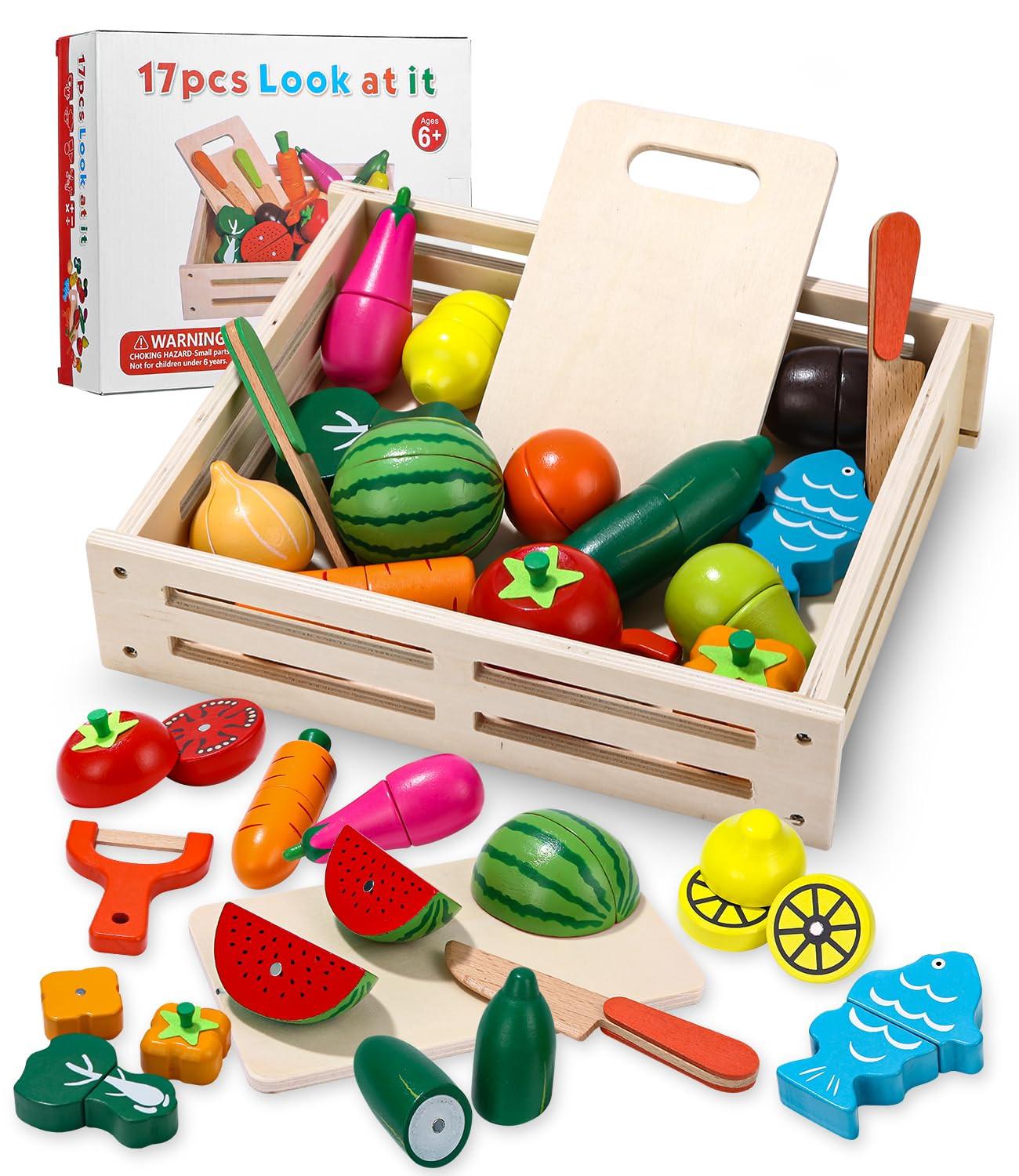 Les accessoires de cuisine en bois pour enfants comprennent des couteaux en bois, des palettes en bois, des chips de papaye et 12 types de jouets en fruits et légumes : oignons, oranges, citrons, poires, kiwis, pastèques, tomates, poissons, choux, poivrons, aubergines, carottes, concombres. Par rapport à d'autres jouets fruitiers en bois, nous disposons de plus d'accessoires et d'éléments plus riches. Les beaux légumes en bois colorés offrent un jeu de rôle pour être créatif. Cette taille convient aux enfants pour saisir, entraîner la coordination main-œil et reconnaître. Les enfants apprennent le nom et les caractéristiques de chaque fruit et développent leurs capacités cognitives. * Chaque jouet de cuisine en bois pour enfants est relié par un aimant, avec la résistance de coupe des enfants et la sensation de coupe réaliste, chaque fruit a la texture originale à l'intérieur, très proche de la réalité du fruit. Le design avec des bords lisses protège bien les mains de votre enfant.