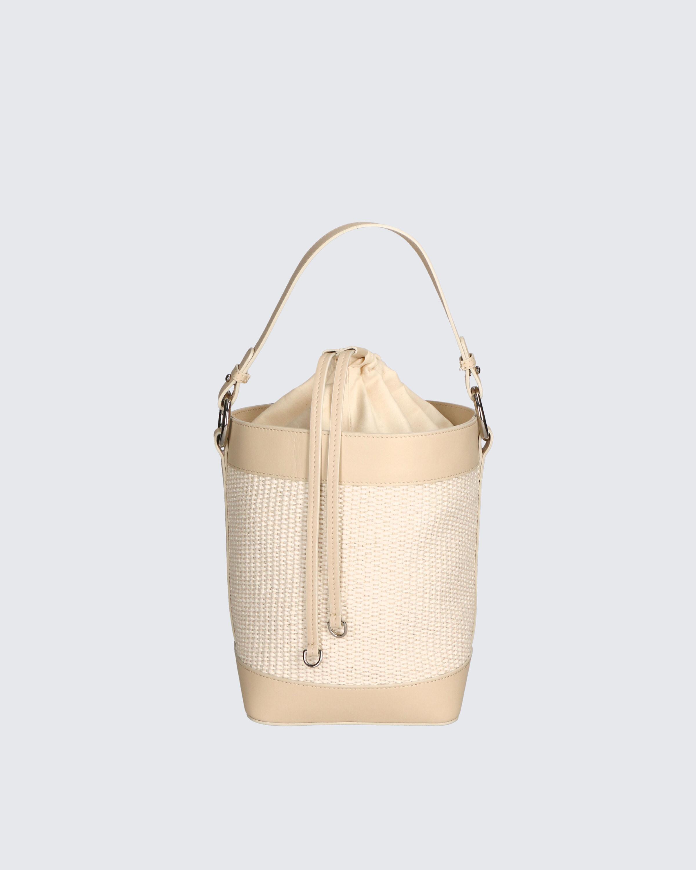 Ce sac seau présente un charmant design tressé, complété par des accents lisses. Le sac est équipé d'une fermeture à cordon pour sécuriser les effets personnels, ce qui en fait un accessoire élégant et pratique pour diverses occasions.