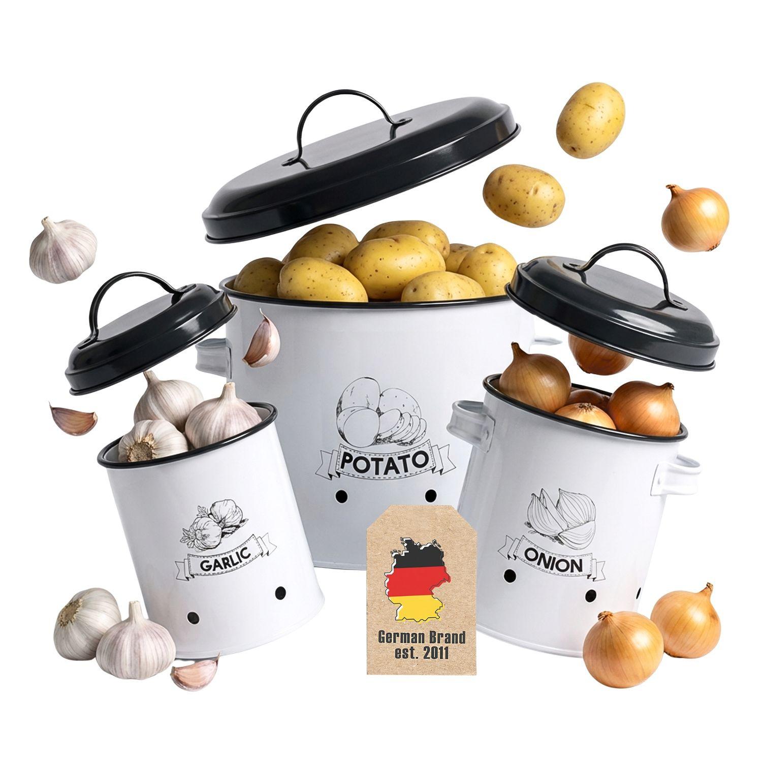 Le set de 3 boîtes de conservation en métal blanc avec couvercle gris est idéal pour conserver des aliments tels que les pommes de terre, les oignons et l'ail dans la cuisine.