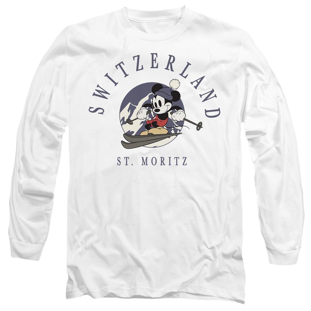 Ce t-shirt à manches longues présente un graphique ludique de Mickey Mouse skiant à St. Moritz, en Suisse. Le design capture un esprit amusant et aventureux, ce qui en fait un ajout charmant à toute garde-robe décontractée.