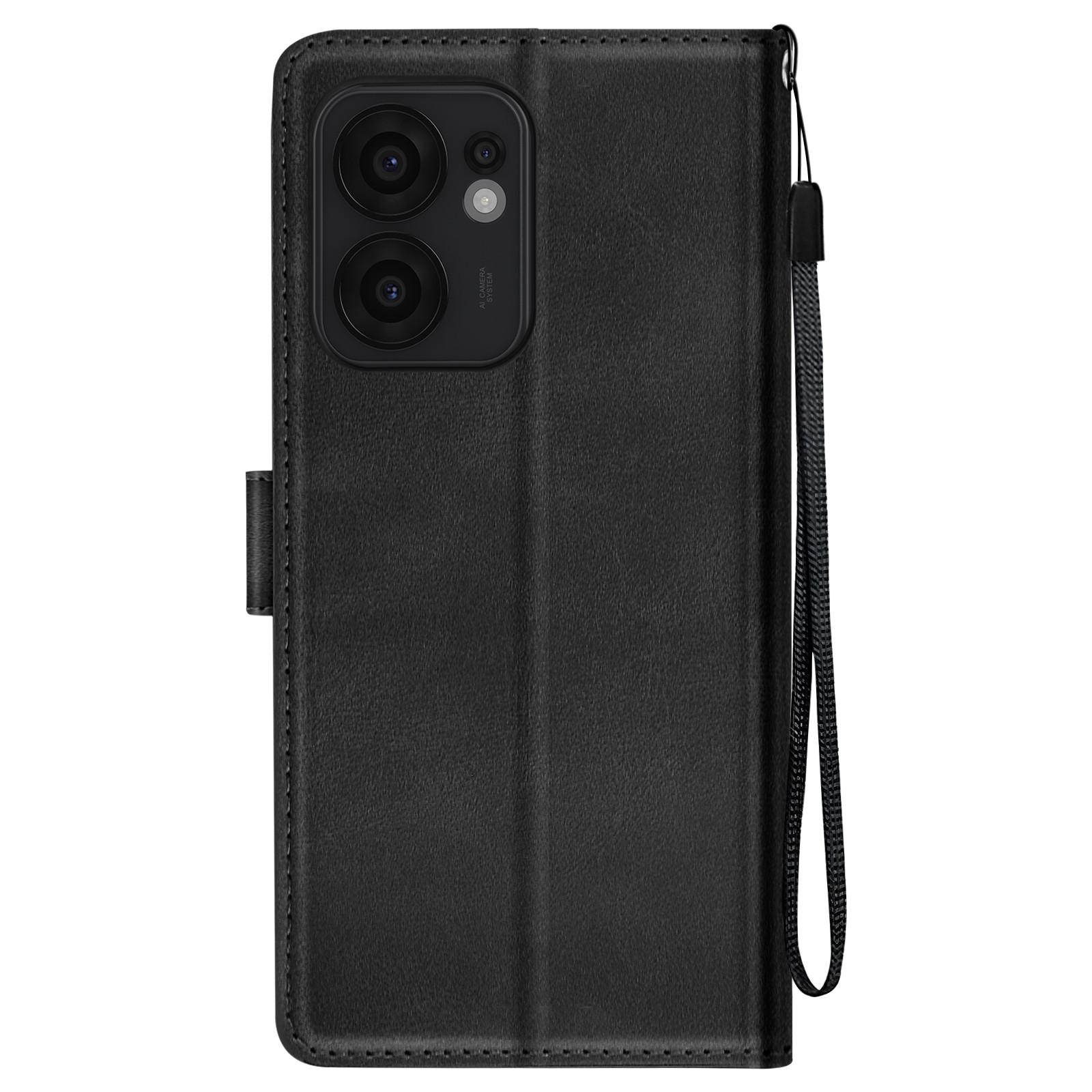 Housse avec dragonne pour Oppo Reno 13 F et 13 FS. Espaces de rangement pour cartes + pochette latérale pour billets. Fonction support vidéo. Revêtement en simili cuir noir aux finitions surpiquées. Fonctionnalités accessibles et boutons redessinés.