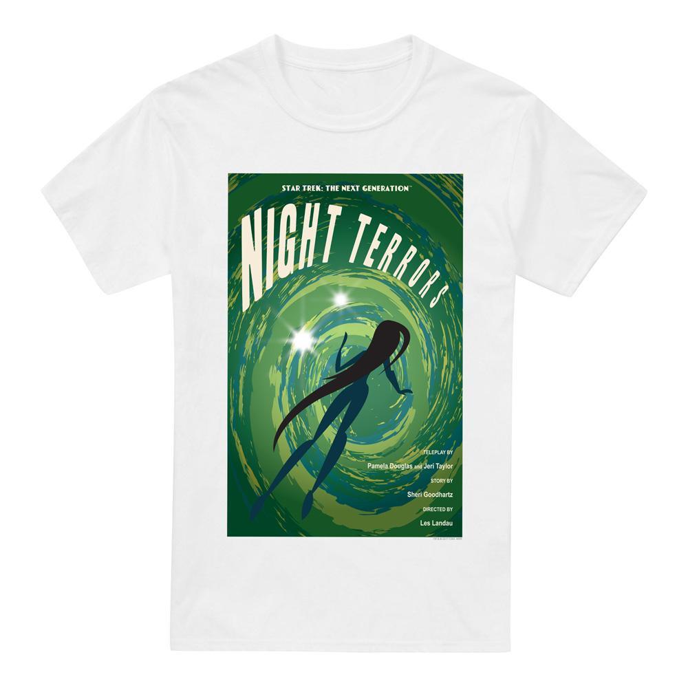 Ce T-shirt présente un imprimé graphique inspiré de « Night Terrors », saison 4 épisode 17 de Star Trek: The Next Generation. Le design capture l'essence de l'épisode avec une représentation stylisée d'un personnage au milieu d'un fond vert et bleu tourbillonnant, évoquant l'atmosphère mystérieuse et troublante de l'histoire.