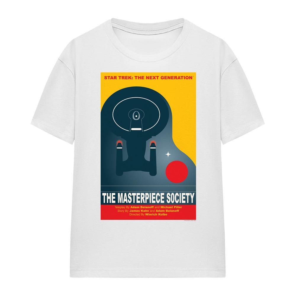 Ce T-shirt présente un imprimé graphique inspiré de « Star Trek: The Next Generation » Saison 5, Épisode 13, intitulé « The Masterpiece Society ». Le design met en scène une représentation stylisée de l'USS Enterprise D sur un fond jaune et bleu vif, avec un cercle rouge et un accent d'étoile blanche. Le titre de l'épisode et les crédits de production sont également inclus dans le design.