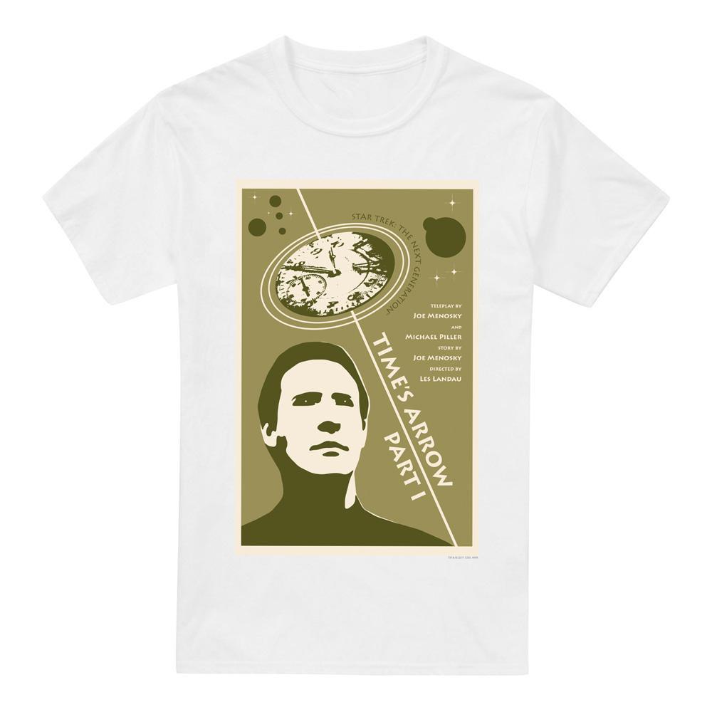 Ce T-shirt présente un imprimé graphique inspiré de "Star Trek: The Next Generation" Saison 5, Épisode 26, intitulé "Time's Arrow Part I". Le design met en valeur un personnage proéminent et des éléments thématiques de l'épisode, en faisant une pièce distinctive pour les fans.