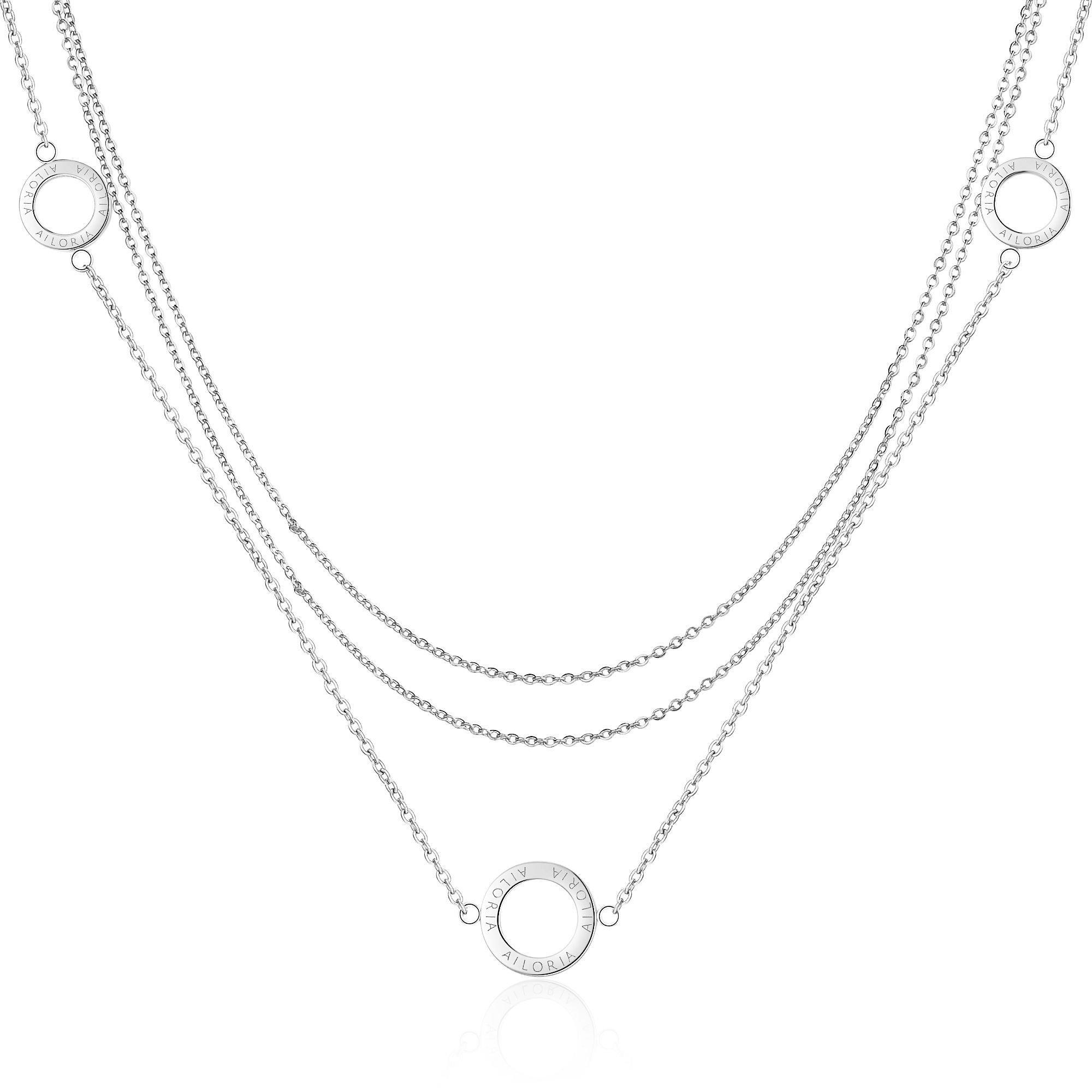 Le charmant collier à trois rangs avec ses anneaux et ses chaînes est un accessoire à la mode qui peut être porté en toute occasion. La merveilleuse combinaison de l'acier inoxydable brillant et des formes courbes exprime chaque regard sur la brillance et le caractère individuel. L'aspect triple rang très tendance, combiné à la simplicité et à l'élégance des courbes polies, crée un jeu d'ombres et de lumières. Ce mélange de beauté moderne et non conventionnelle incarne la légèreté et l'élégance féminine par son style simple.