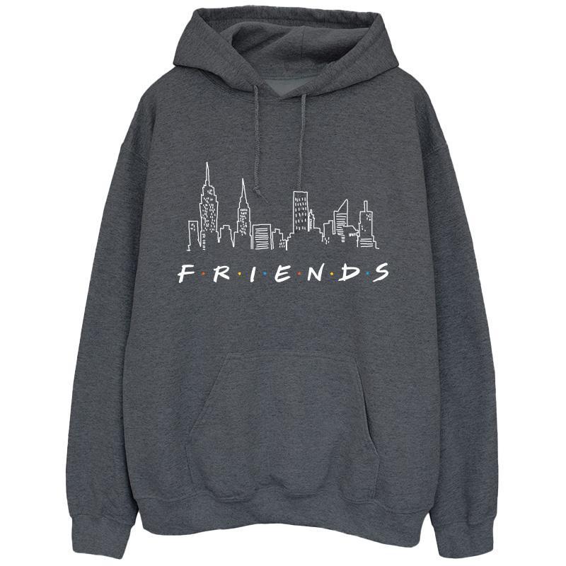 Ce sweat à capuche présente un design classique avec une capuche à cordon de serrage et une poche kangourou, offrant à la fois confort et praticité. Le devant est orné d'un imprimé graphique d'un paysage urbain et du logo emblématique "FRIENDS", ce qui en fait un choix élégant pour les fans de la série.