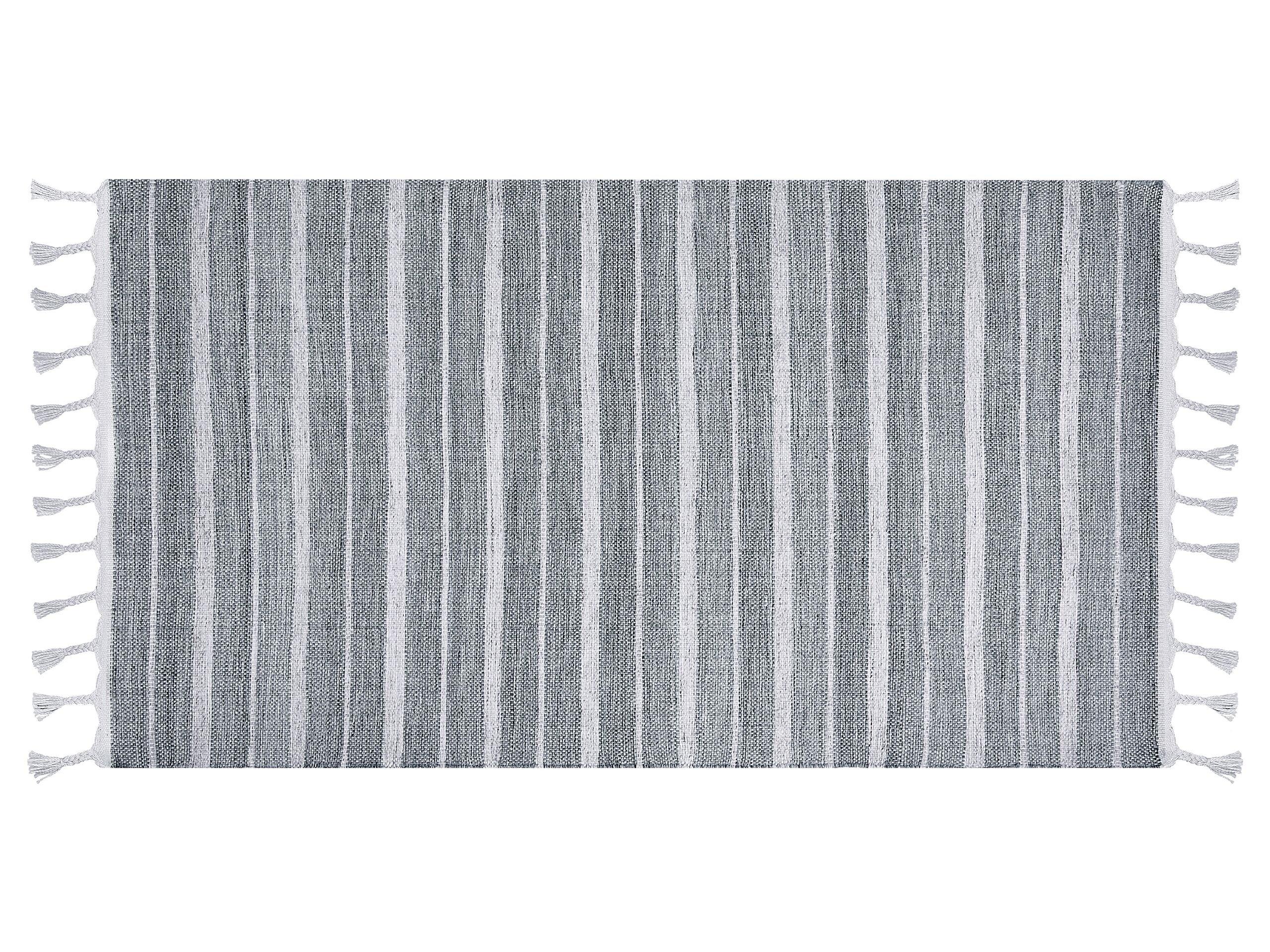 Tapis rayé à pompons. Des couleurs classiques et un design basique font de ce tapis un accessoire universel mais élégant pour tout type d'intérieur. Tissé à la main à partir de matériaux entièrement recyclés, ce tapis est non seulement unique mais aussi écoresponsable. Grâce à la composition du matériau, il peut être utilisé à l'intérieur comme à l'extérieur. Placez-le dans votre salon, sur votre terrasse ou dans un couloir pour profiter de cet accessoire indispensable.