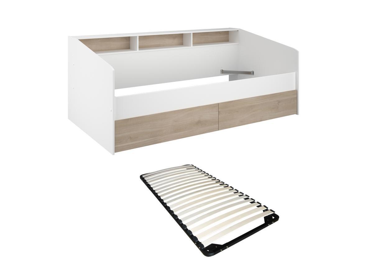 Vente-unique Lit 90 x 200 cm avec rangements - Blanc et naturel + Sommier - PAULETTE