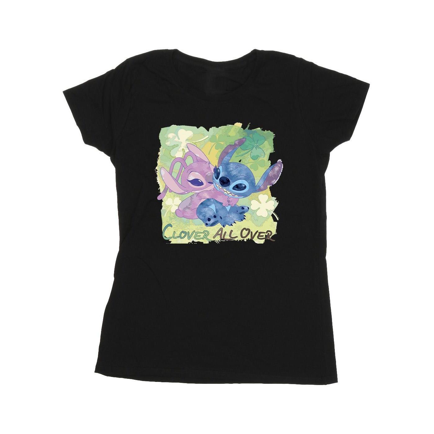 Célébrez la Saint-Patrick avec ce t-shirt festif orné d'un charmant graphique de Stitch et Angel entourés de trèfles. Le design inclut le texte ludique « CLOVER ALL OVER » en bas, ce qui en fait un choix parfait pour cette fête.