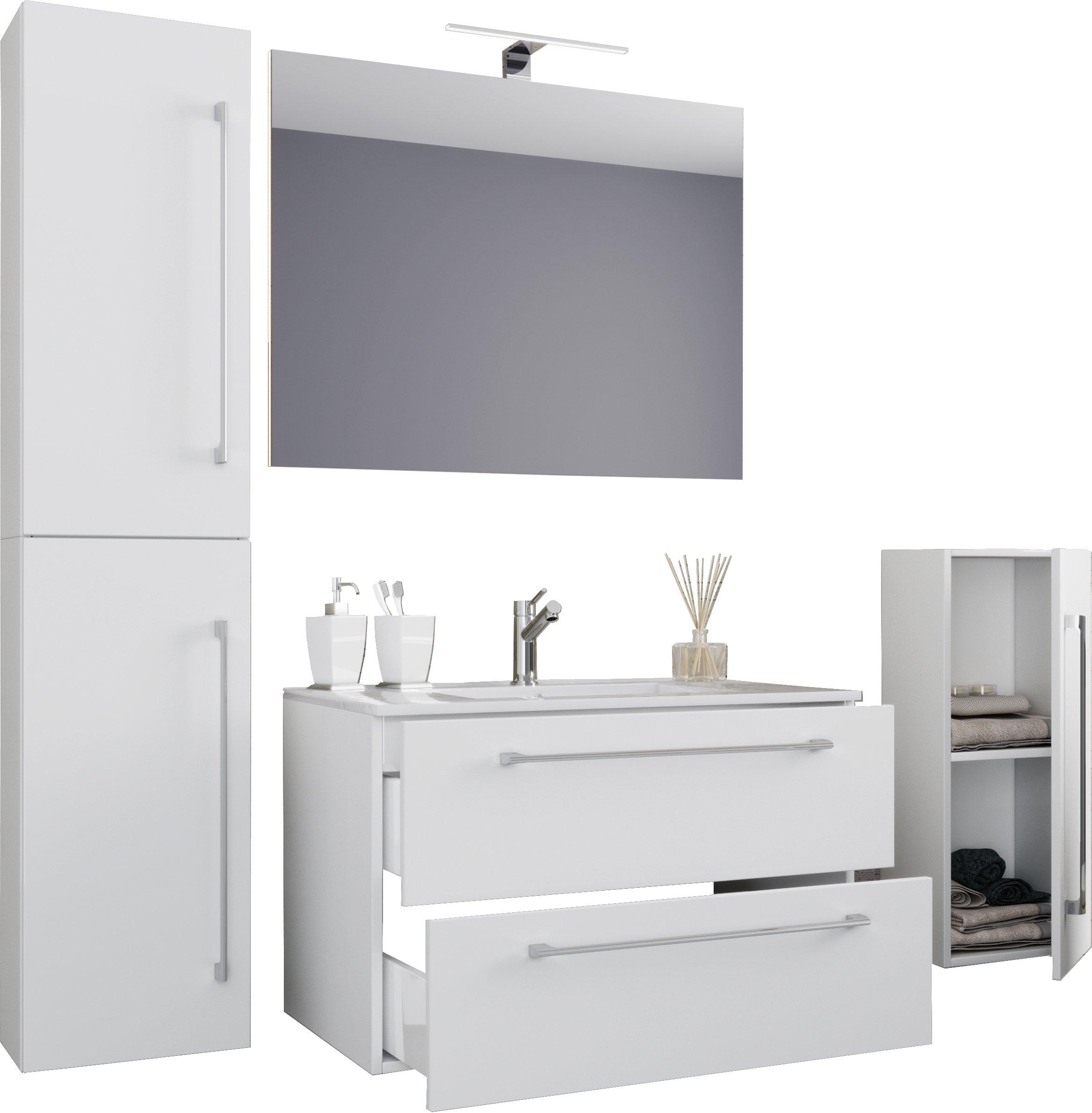 Set composé de : - 1x armoire basse avec deux tiroirs - 1x lavabo en céramique - 1x miroir en verre de sécurité trempé - 1x armoire intermédiaire - 1x armoire haute L'ensemble de meubles de salle de bains se compose d'une armoire haute et d'une armoire intermédiaire, ainsi que d'une armoire basse avec deux tiroirs sur rails métalliques robustes et de deux armoires latérales. Un lavabo moderne en céramique massive et un miroir en verre de sécurité ESG complètent le meuble afin d'obtenir une prise d'eau parfaite dans la salle de bains. Meuble sous-lavabo - dimensions H. 52 x l. 61 x P. 46 cm ou H. 52 x l. 81 x P. 46 cm - Corps en mélamine robuste et inusable - Deux grands tiroirs avec coulisses métalliques durables - Poignée aspect aluminium en métal Vasque : - Dimensions H. 17 x l. 60 x P. 46 cm ou env. H. 17 x L. 80 x P. 46 cm - En céramique robuste Miroir : - Dimensions H. 40 x L. 80 P. 2 cm ou env. H. 40 x L. 60 P. 2 cm - Verre en verre de sécurité ESG Armoire centrale : - Dimensions