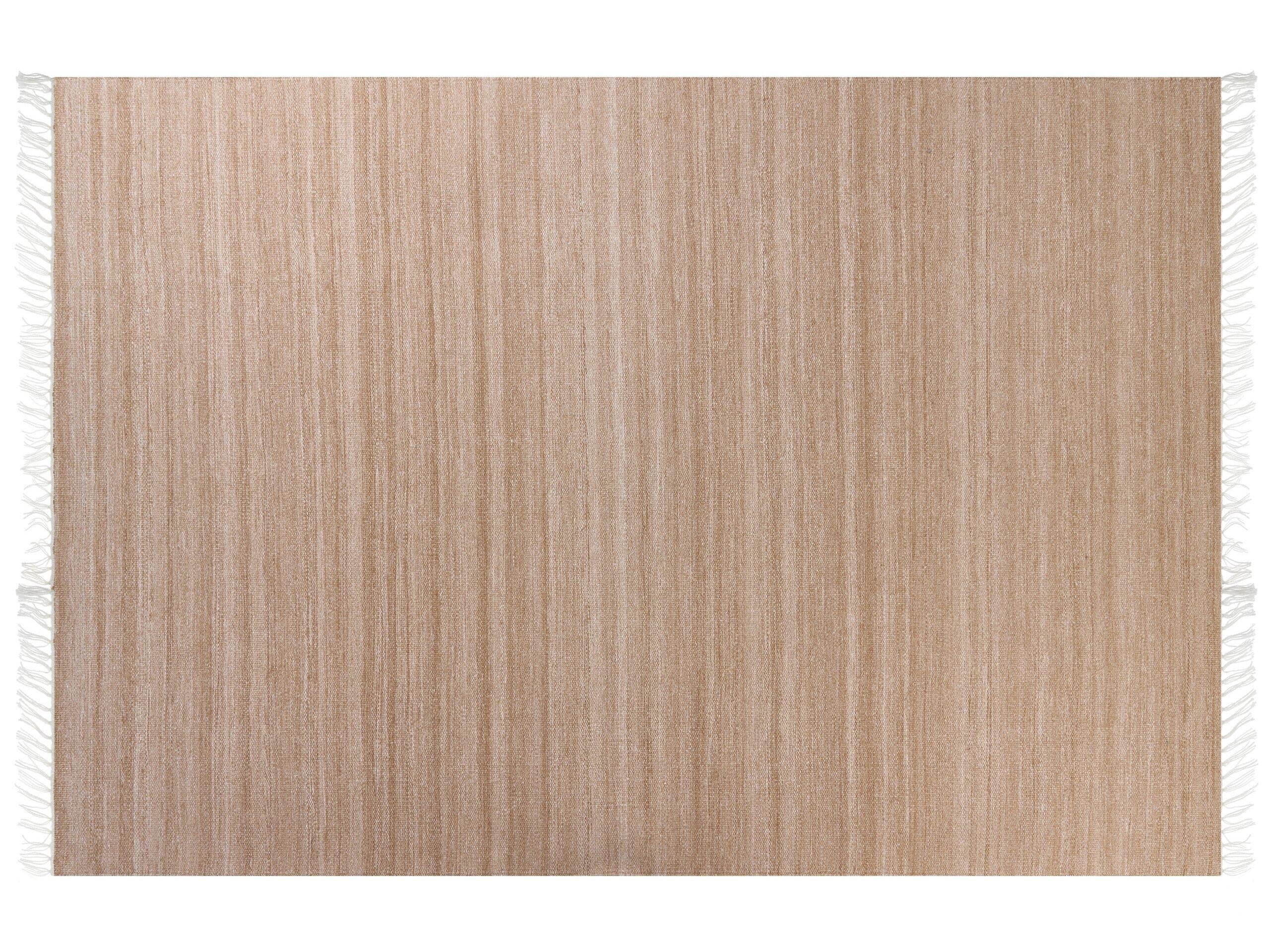 Tapis à franges unicolore. Un tel tapis est la touche finale parfaite d'un intérieur ou d'un espace extérieur comme une terrasse ou un patio. Tissé à la main à partir de fibres plastiques recyclées, il est facile à nettoyer et durable, ce qui le rend adapté aux zones à fort trafic. Les tapis en fibres synthétiques sont une bonne solution pour les maisons avec des animaux domestiques et les personnes allergiques, car ils n'accumulent pas la poussière. Cette pièce tissée à plat présente une texture semblable à celle de la laine, agréable au toucher, et grâce à sa couleur neutre, elle peut être facilement assortie à de nombreux styles d'intérieur.