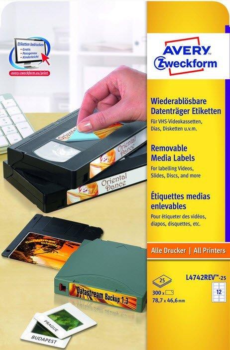 Avery-Zweckform, AVERY ZWECKFORM Video-Etiketten 78,7x46,6mm L4742REV-25 weiss,non-perm. 300Stk./25Bl.