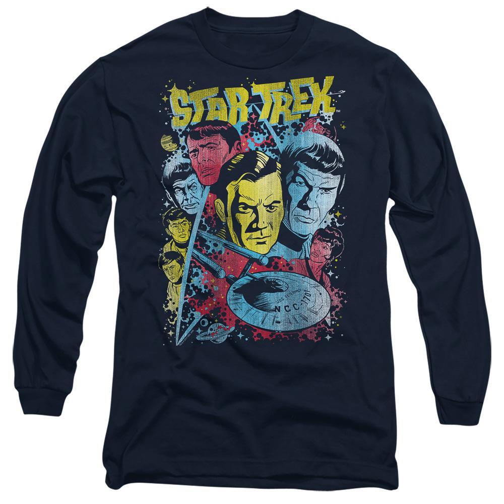 Ce t-shirt à manches longues présente un imprimé graphique vibrant inspiré de la série classique Star Trek. Le design met en valeur des personnages et des éléments emblématiques de la franchise de science-fiction bien-aimée, ce qui en fait un ajout distinctif à la garde-robe de tout fan.