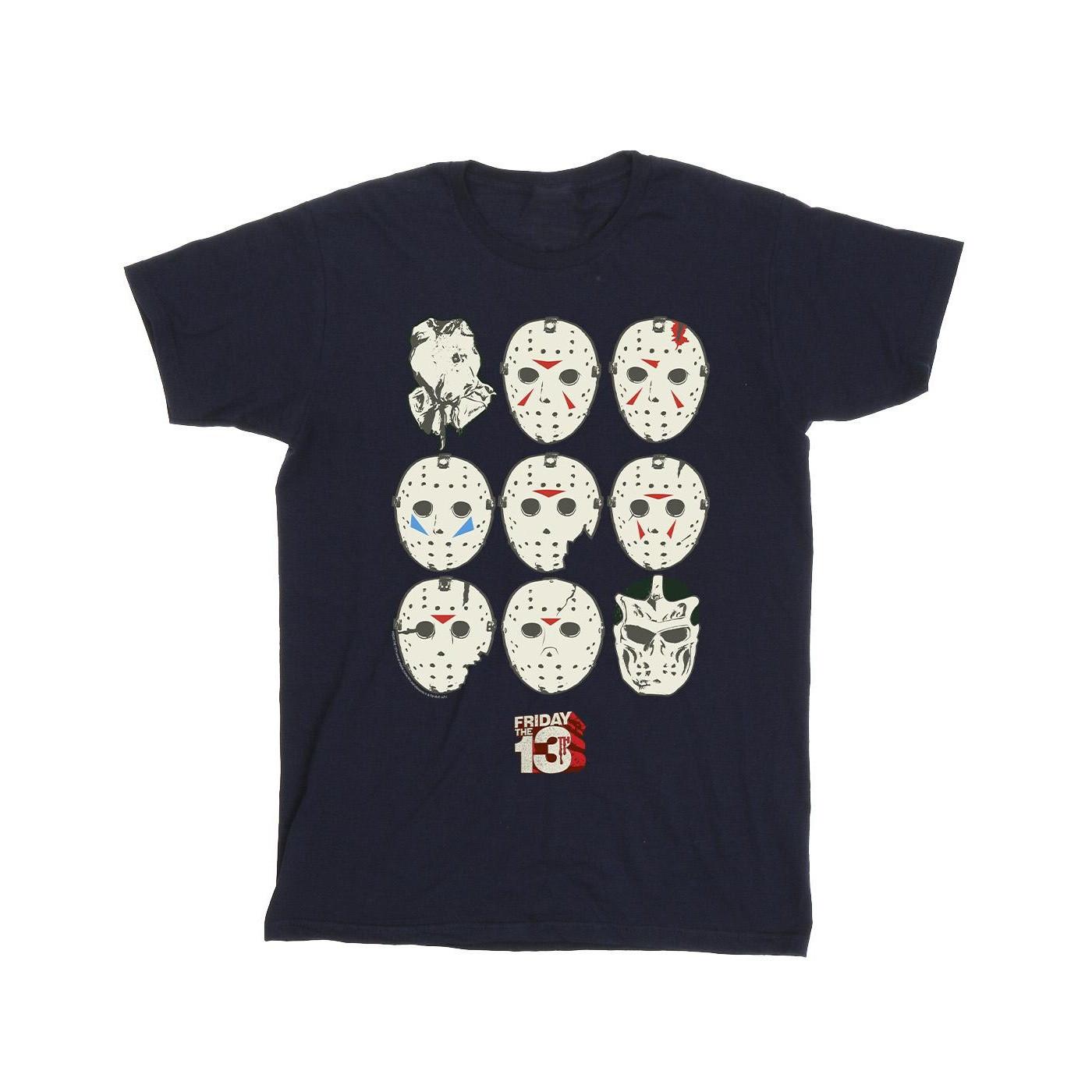 Ce T-shirt présente un imprimé graphique de divers masques de Jason Voorhees de la franchise d'horreur emblématique Friday the 13th. Le design met en valeur l'évolution du masque de Jason à travers les films, en faisant une pièce distinctive pour les fans.