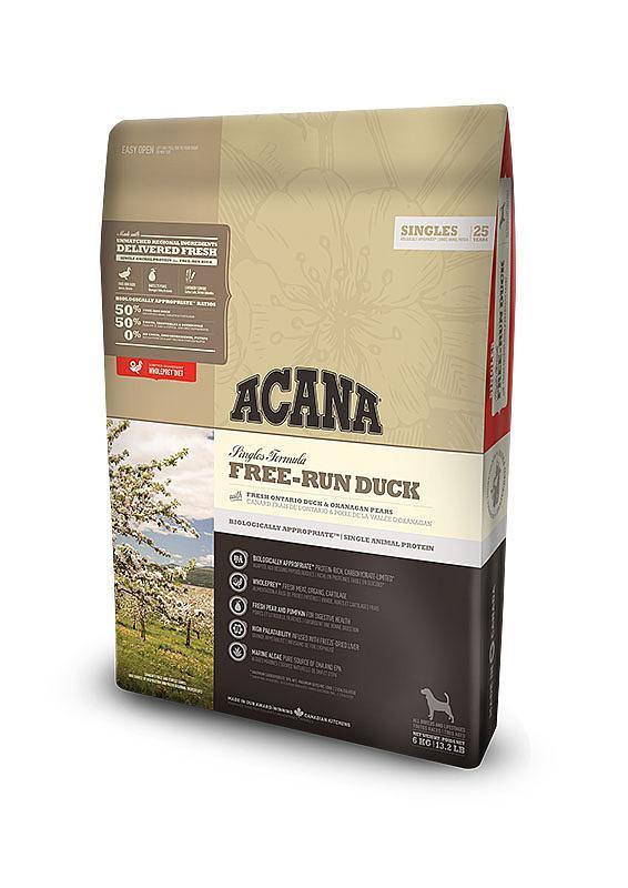 Acana Dog Singles Free-Run Duck Acana Singles Free-Run Duck est un aliment monoprotéique, ce qui signifie que cet aliment ne contient qu'une seule source de protéine animale. Le canard est considéré comme un type de viande particulièrement bien toléré, c'est pourquoi cet aliment complet convient également aux personnes allergiques.