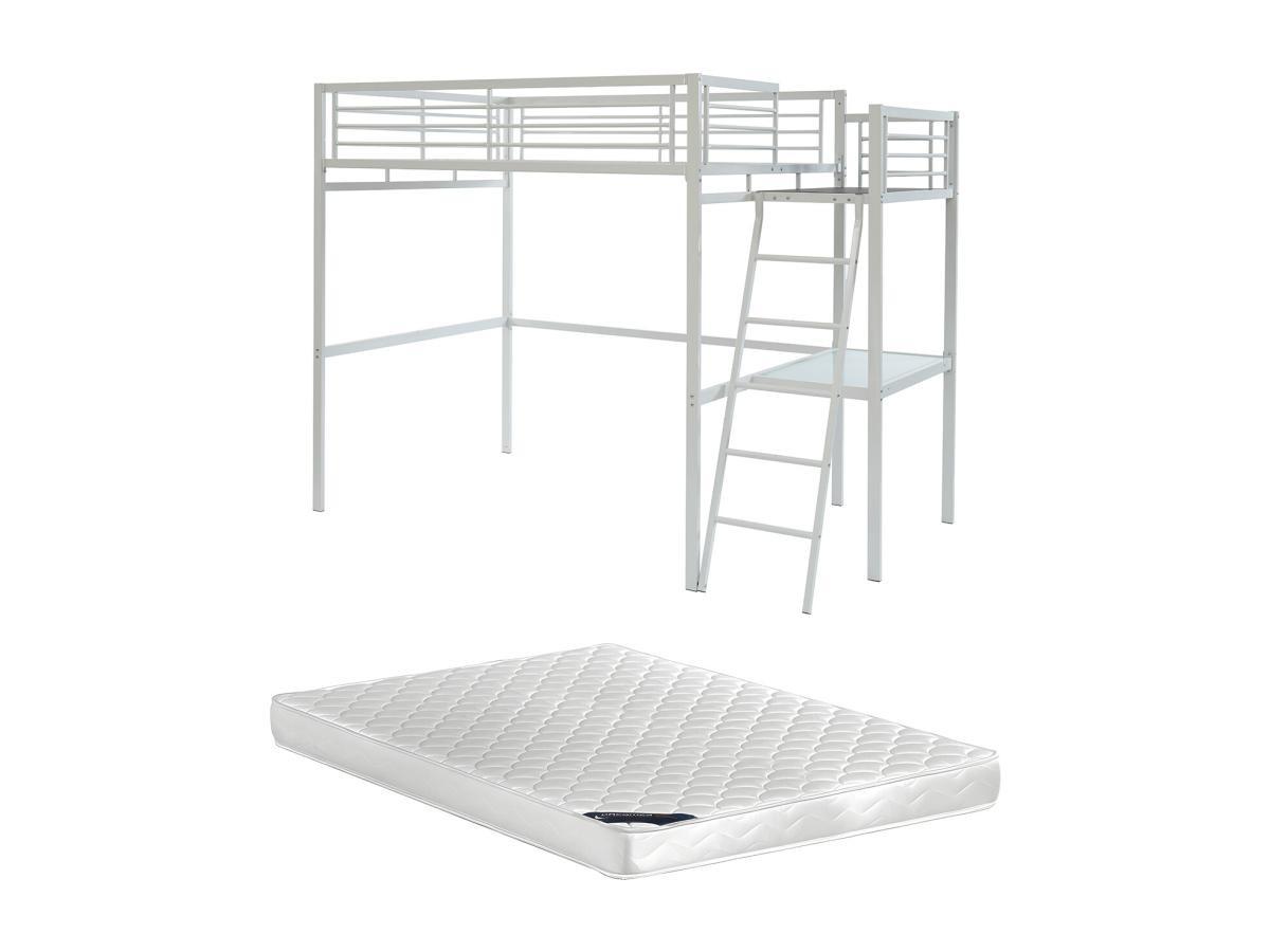 Vente-unique, Lit mezzanine CASUAL II - 140 x 190 cm - plateforme bureau - Blanc + matelas