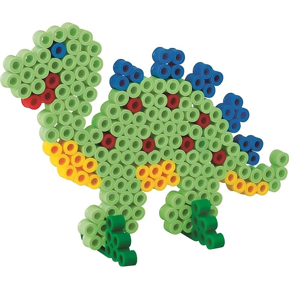 Set mit etwa 250 bunten Bügelperlen in verschiedenen Farben, einer transparenten Steckplatte in Dino-Form, Motivvorlage und Bügelpapier. Die Maxi-Perlen haben einen Durchmesser von 10 mm und sind ideal für Kinder ab 3 Jahren geeignet. Das Bügeln sollte von einem Erwachsenen übernommen werden.