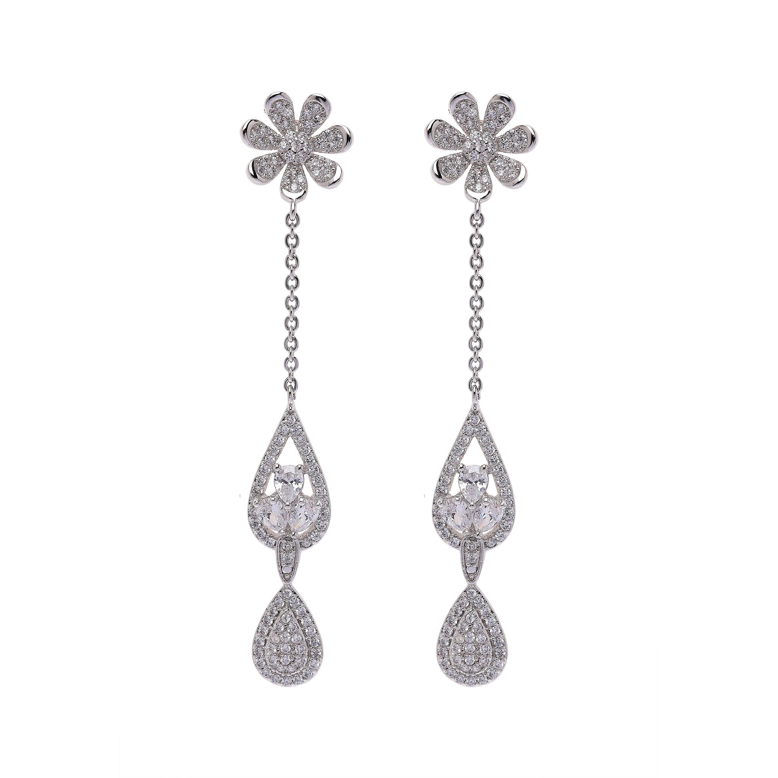 Ces délicates boucles d'oreilles pendantes allient le charme floral à une élégance étincelante. Une fleur sertie de cristaux est suspendue à une fine chaîne, se terminant par un pendentif en forme de larme orné de cristaux finement travaillés. Le bijou se conclut par une larme plus grande, sertie de cristaux pavés, créant un effet gracieux et lumineux. Dimensions : 1,1 cm x 5,3 cm | Placage : Rhodium | Fermoir : Tige et ardillon