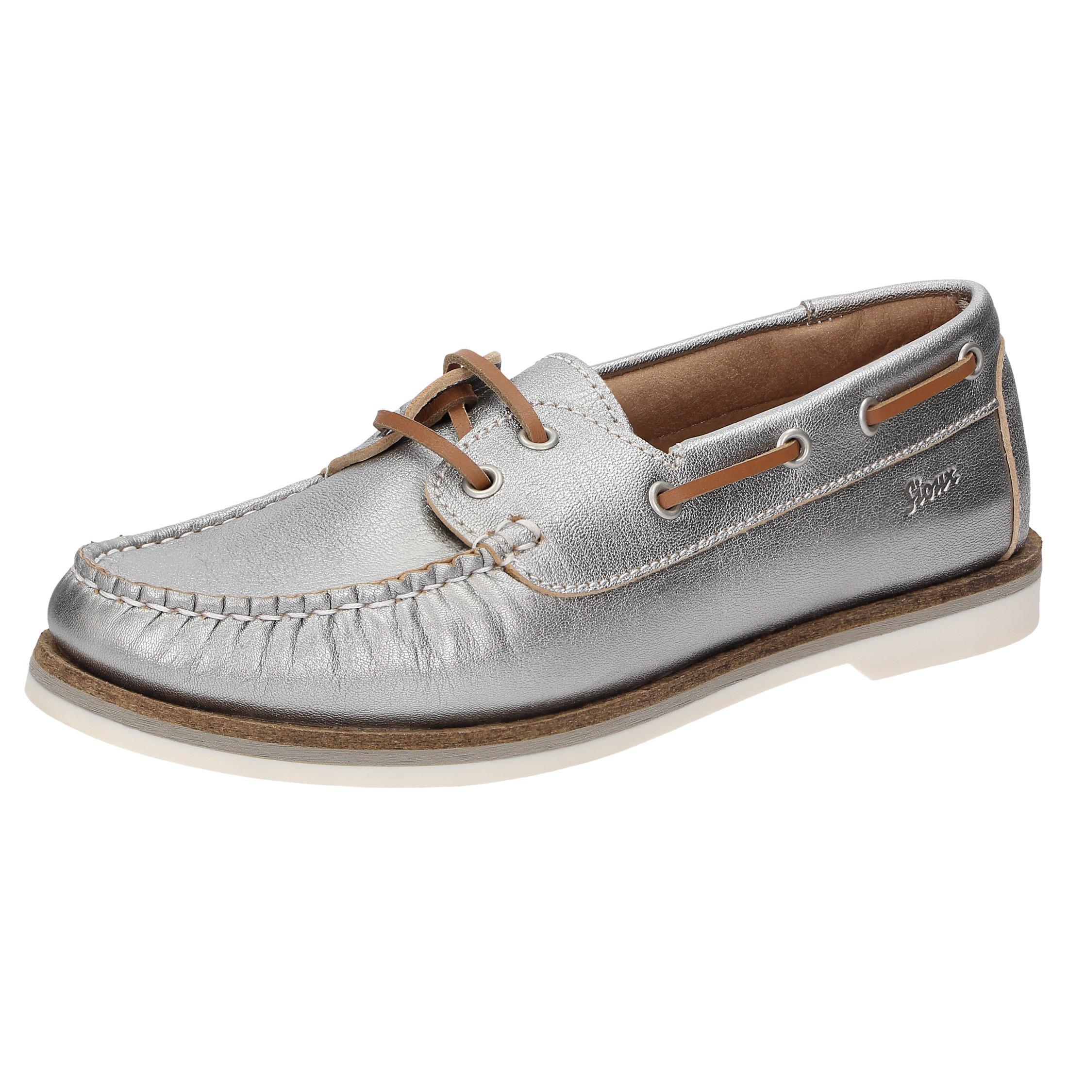 Le mocassin Nakimba-700 est une chaussure à lacets non doublée pour femme, sportive et au look docksider tendance. Elle est fabriquée en cuir de chèvre métallisé et dispose d'une première de propreté en cuir souplement rembourrée, amovible et remplaçable par une semelle personnalisée. Une semelle extérieure souple et fine en caoutchouc avec un léger talon compensé et une largeur confortable G pour une liberté optimale des orteils complètent harmonieusement ce modèle.