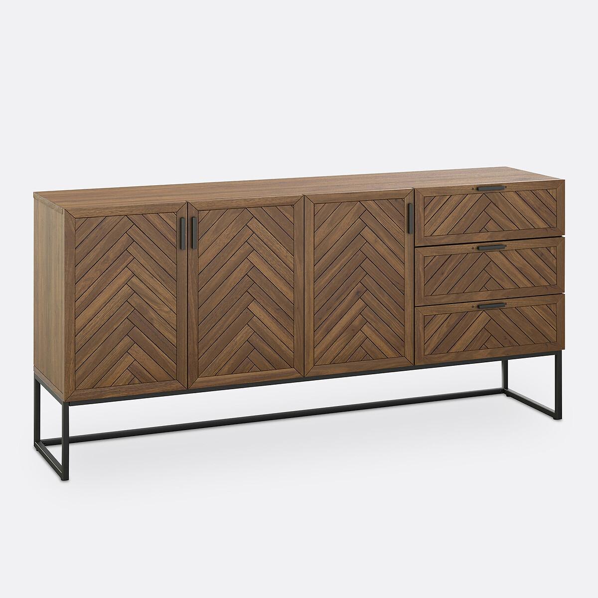 Le buffet 3 portes, 3 tiroirs NOTTINGHAM. Une ligne classique et rassurante en pin massif ciré revisité à la façon d’un parquet chevrons. Ce buffet enfilade offre un bel espace de rangement dans un style chaleureux.Description