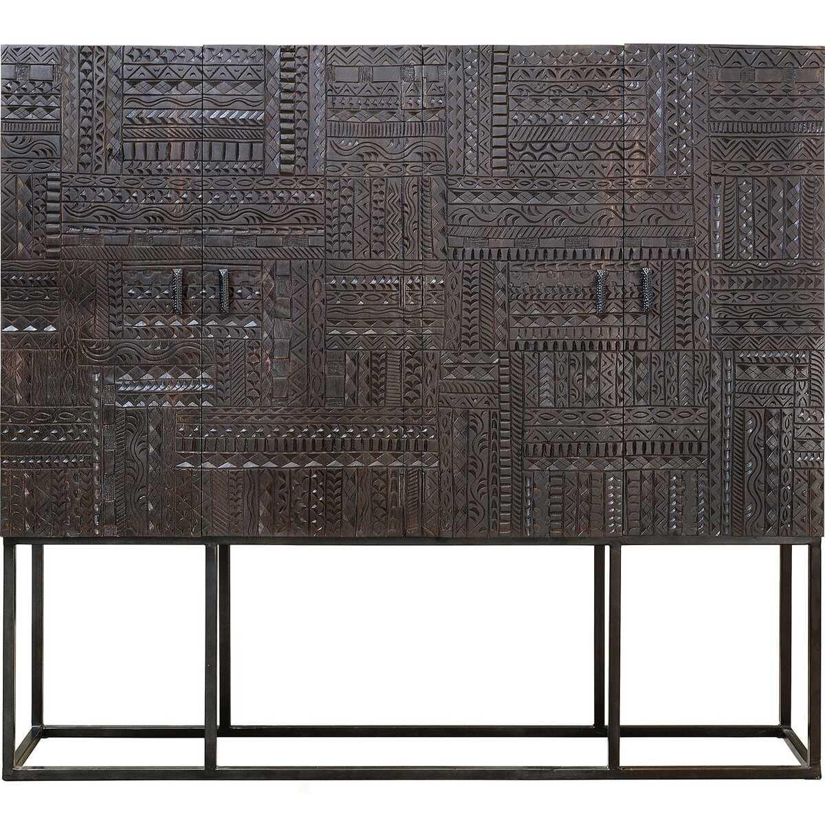Armoire 4 portes en bois de manguier massif. Portes avec décorations hiéroglyphiques sculptées à la main. Le cadre et les poignées sont en fer laqué noir. Dimensions de la porte : 109 cm de hauteur x 44 cm de largeur. Hauteur des pieds : 55 cm. Le produit est livré assemblé.
