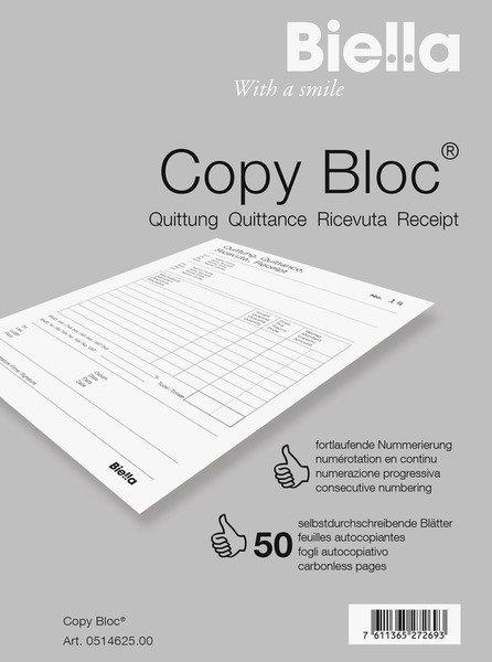 COPY-BLOC® - Quittungen Mit dem Durchschreibeblock von Biella sind Quittungen schnell und übersichtlich notiert. Dank fortlaufender Nummerierung und Doppel haben Sie jederzeit ein Nachschlagewerk zur Hand. Selbstdurchschreibend Farbe: weiss/grau Inhalt/Blatt: 2 x 50 Blatt Mit Einlagekarton