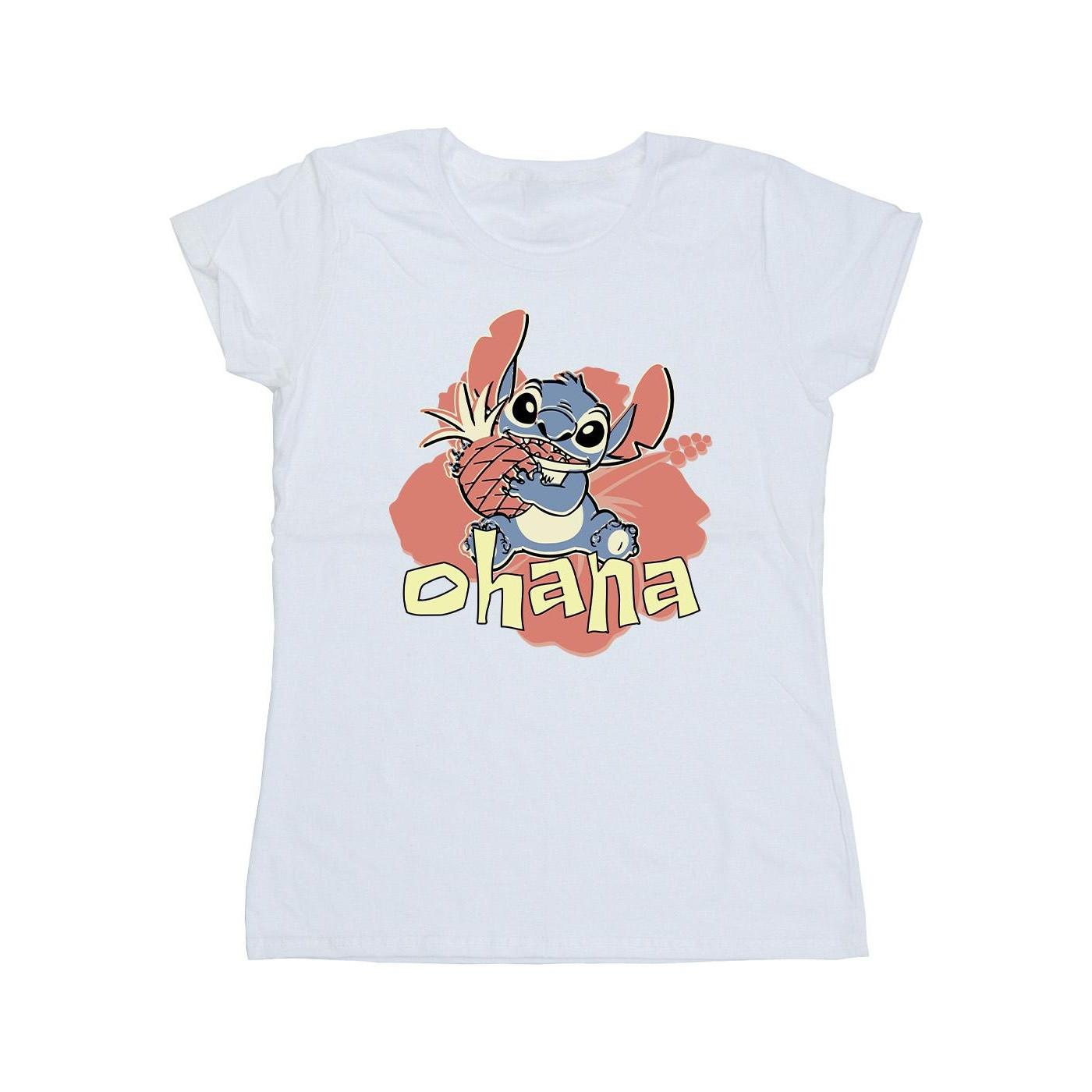 Ce T-shirt présente un imprimé graphique ludique de Stitch de Lilo & Stitch de Disney, tenant un ananas avec le mot « Ohana » en dessous. Le design est placé sur un fond floral stylisé, ajoutant une touche de charme tropical. Ce T-shirt confortable est un ajout charmant à toute garde-robe décontractée.