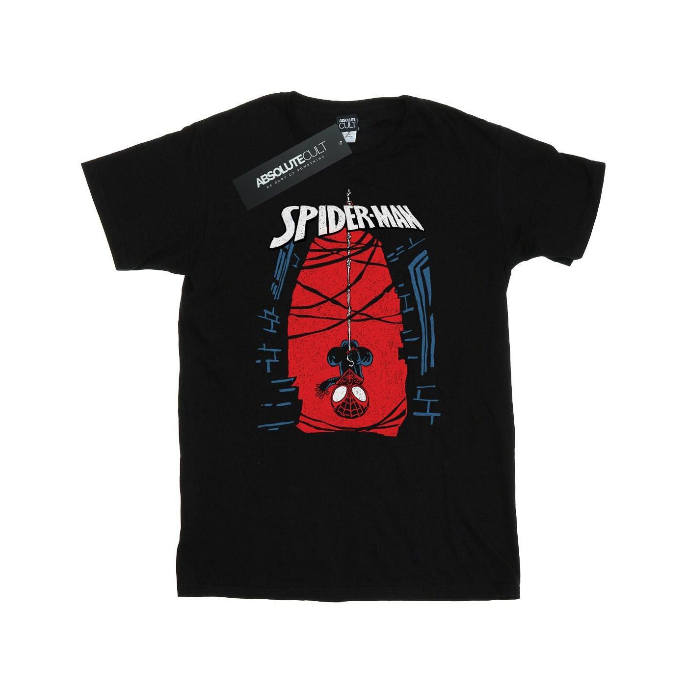Ce T-shirt présente un col ras-du-cou classique et des manches courtes, offrant une coupe confortable et polyvalente. Le design met en scène Spider-Man suspendu à l'envers, ajoutant une touche dynamique et iconique au vêtement.