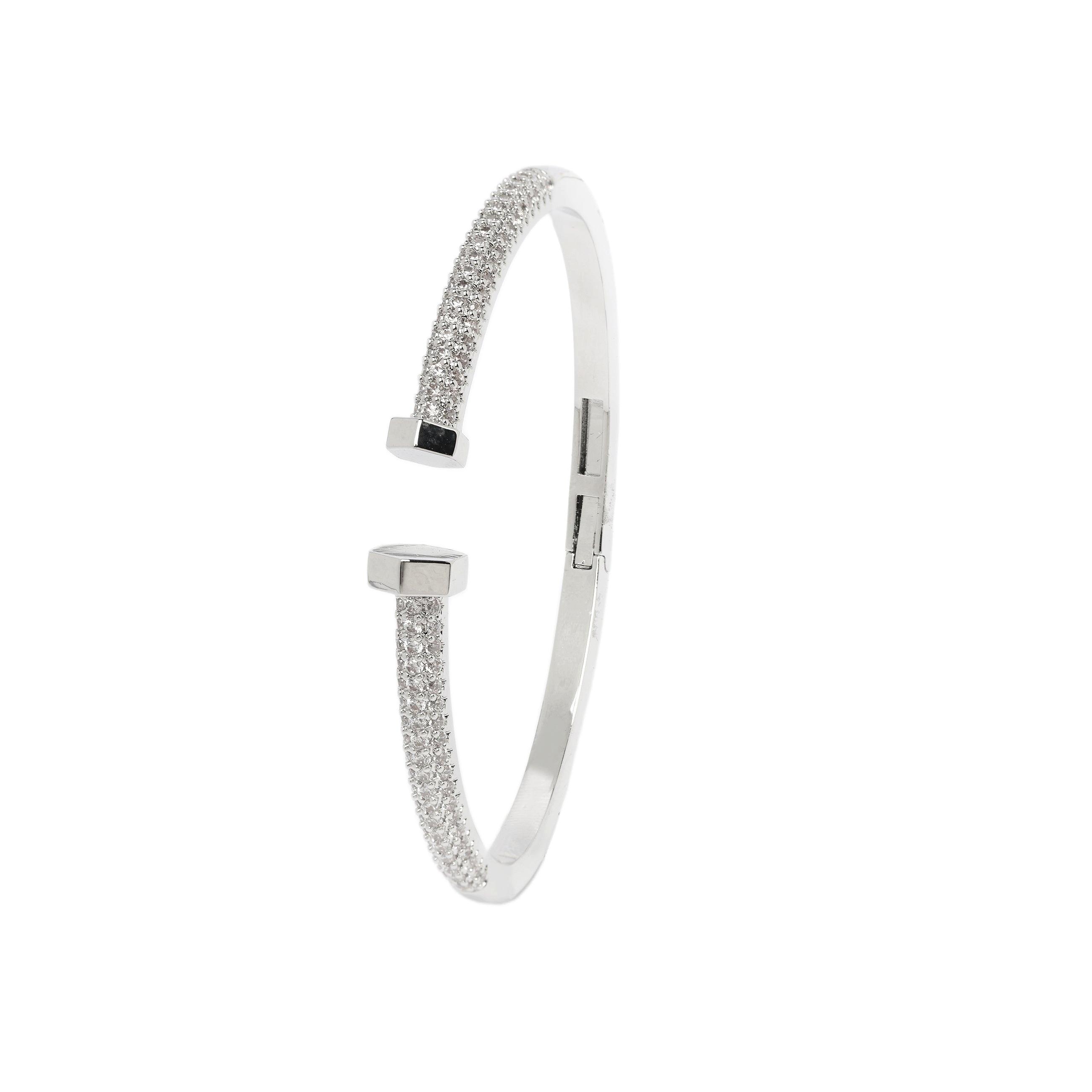 Son design épuré et ouvert est orné d'une multitude de pierres scintillantes, pour un style luxueux et captivant. Sa teinte argentée chaude apporte une touche de sophistication, en faisant l'accessoire idéal pour toutes les occasions. Dimensions : 0,7 cm x 6,5 cm | Placage : Rhodium | Fermeture : À enfiler